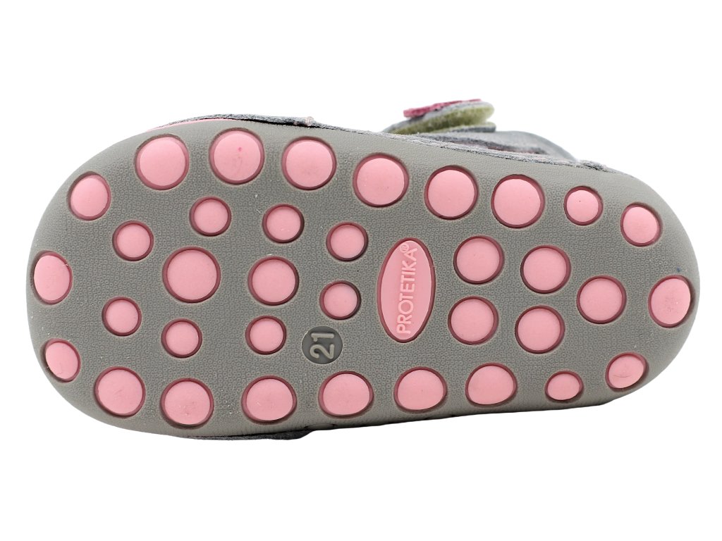 BAREFOOT obuv - letní celokožené sandále PROTETIKA s krytou špičkou. Vyjímatelná stélka. Velice měkkoučké a ohebné. Dostatečně široké i pro širokou nožičku a vyšší nárt. Umožňují tedy volný pohyb prstů a zdravý vývin nohy. Zvednutá špička chrání obuv proti okopání. V zadní části je zvedlá podešev, opatek je v této části pevnější. Tyto barefoot botky se zapínají dvěma pásky na suchý zip a dobře se prozouvají. Svršek je celokožený, boty odolají mírnému vlhku, nesmí se však promáčet. Výstelka je z příjemného měkkého textilního materiálu. Při výrobě byly použity atestované přírodní materiály, které zabezpečují zdravotní nezávadnost obuvi. Zapínání na 2 suché zipy.