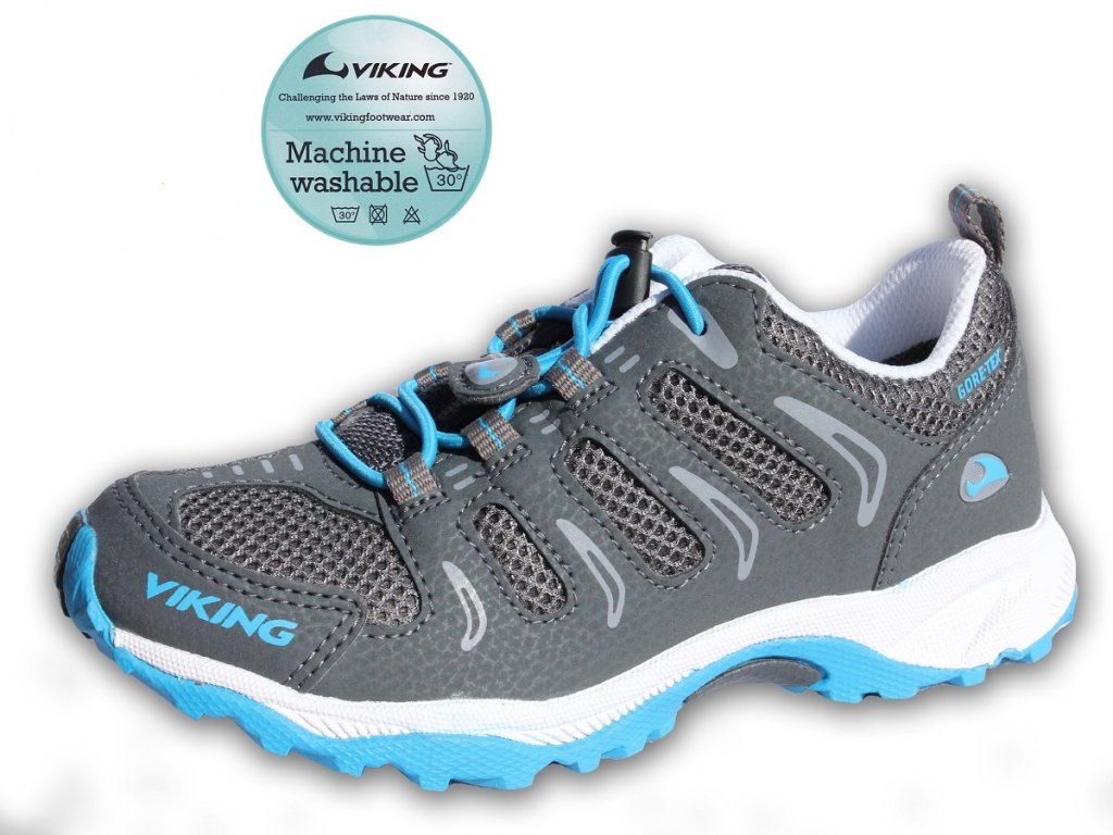 Velice kvalitní kotníkové dětské celoroční botičky s membránou GORE-TEX od norské firmy VIKING. Zapínání na olivku. Boty se dají při zašpinění i vyprat na jemný program v pračce bez použití aviváže!!! Co víc dodat... GORE-tex = KVALITA. Dětské nohy budou v suchu :-)) Moc hezká kombinace několika modrých barev + stažení na olivku.