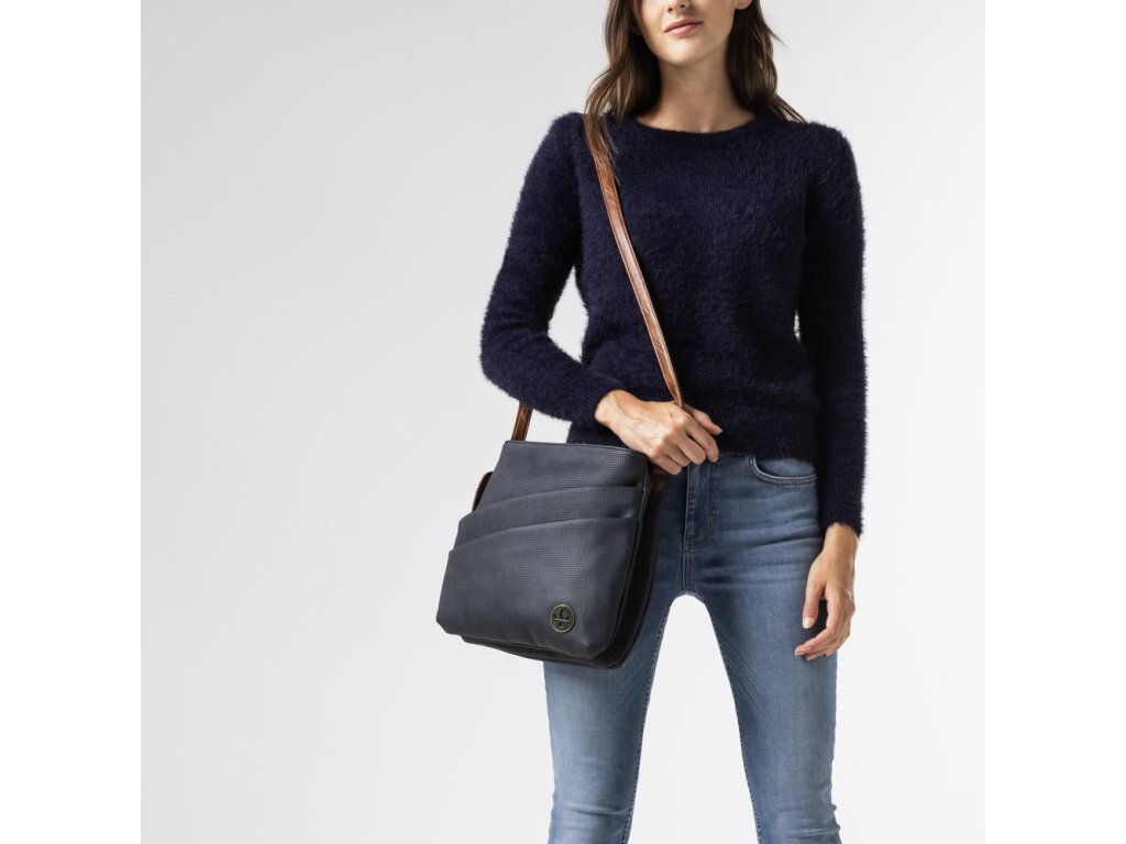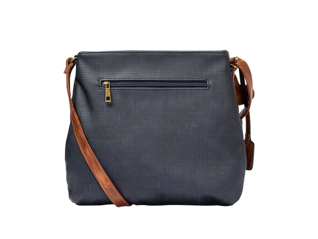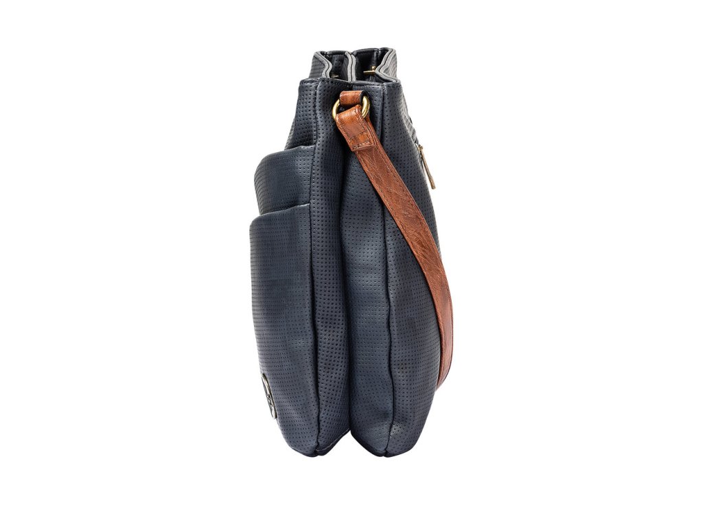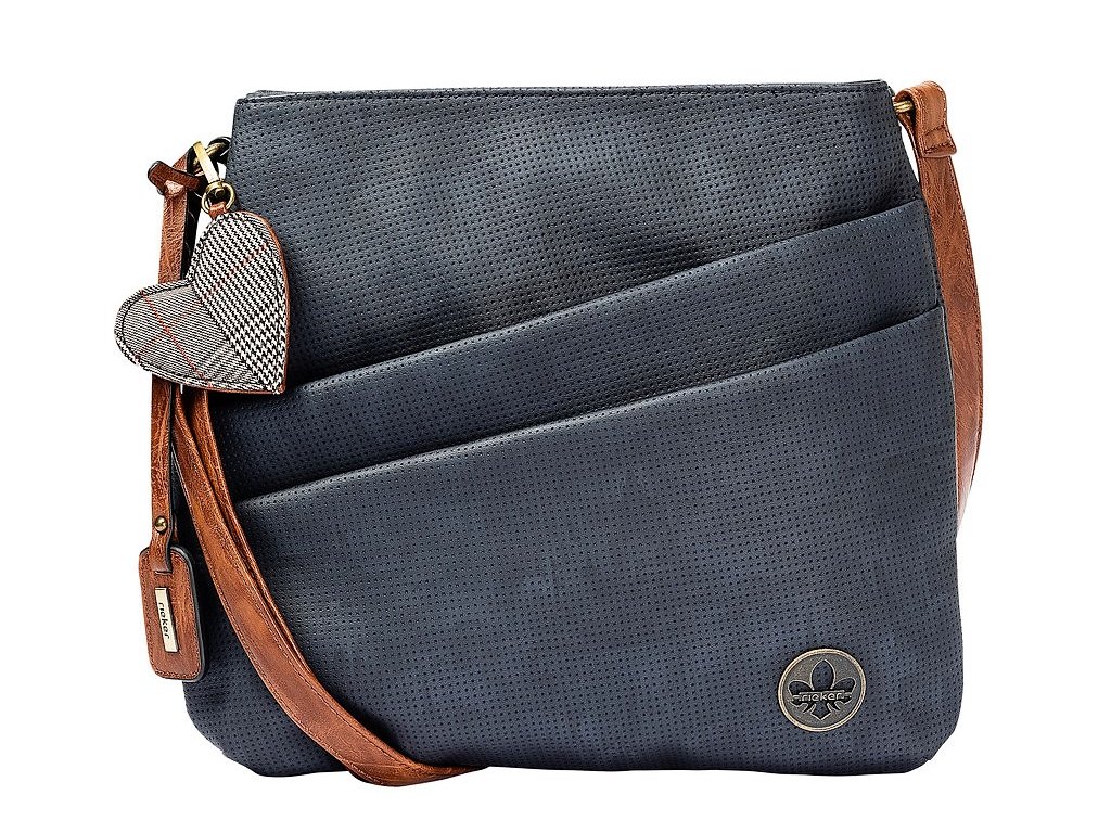 Kabelka má dvě samostatné části, každá je se zapínáním na zip. V přední ani v zadní části nejsou našité kapsičky např. na mobil. Na zadní straně kabelky je další kapsa na zip. V přední části kabelky jsou schované další dvě kapsy, jedna je na zip, druhá na magnet. Ozdoby se dají sundat. Kombinace tmavě modré barvy a hnědých doplňků. Kabelka má dlouhý nastavitelný popruh, který se nedá odepnout.