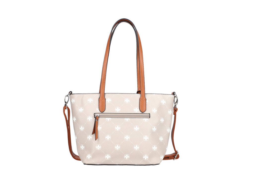 Kabelka má jednu velkou kapsu se zapínáním na zip - uvnitř kabelky v přední části jsou 2 našité otevřené kapsičky např. na mobil, uvnitř zadní části kabelky je našitá větší kapsička se zipem vhodná např. na doklady. Kabelka má 2 krátké uši, které se nedají odepnout. V balení je i dlouhý popruh, který můžete připnout a nosit kabelku přes rameno. Pevné dno chráněno kovovými nýty. Kombinace hnědé a šedé barvy, potisk s logem výrobce ve světlé barvě. Ozdoba se dá sundat.