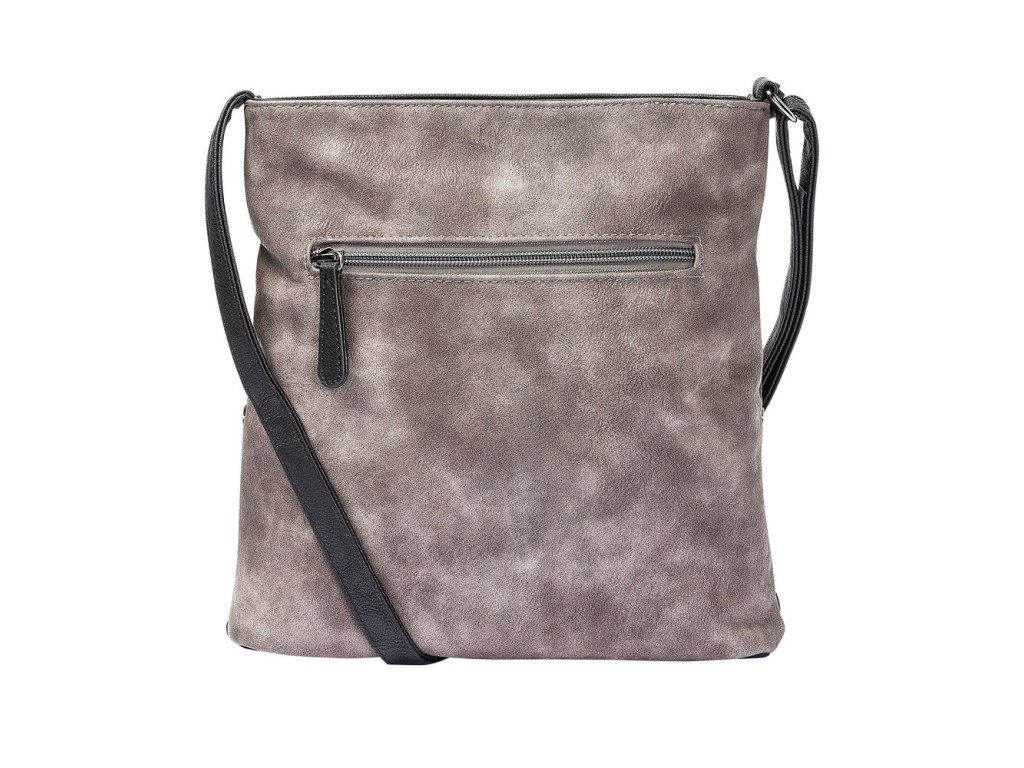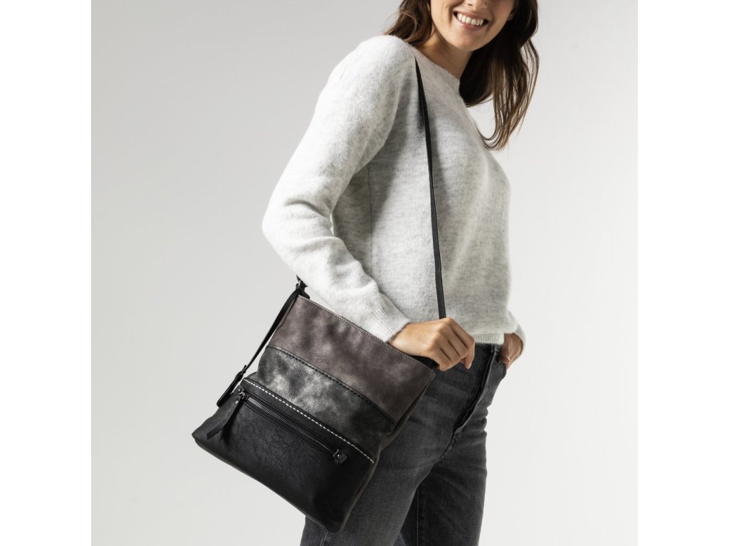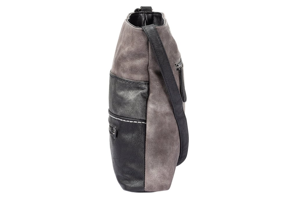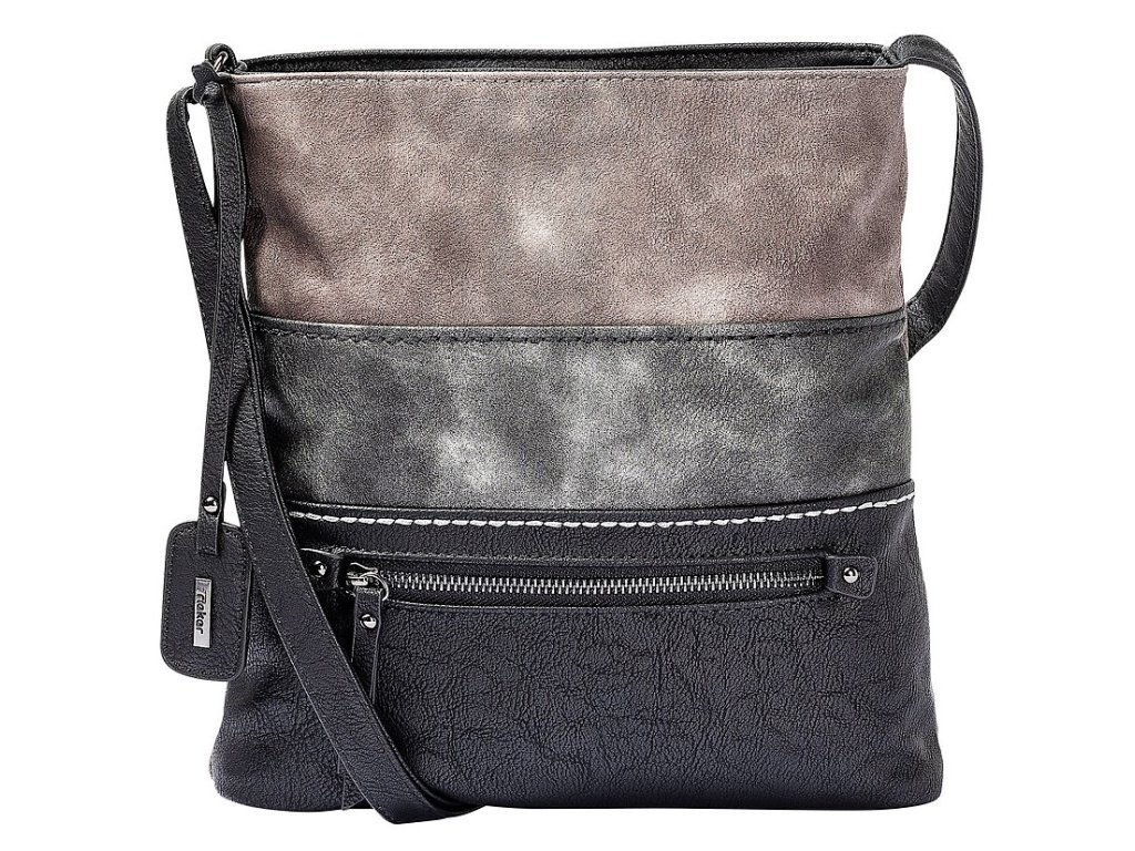 Kabelka má 2 samostatné části se zapínáním na zip - uvnitř kabelky v přední části jsou 2 našité otevřené kapsičky např. na mobil, uvnitř zadní části kabelky je našitá větší kapsička se zipem vhodná např. na doklady. Na zadní straně kabelky je další kapsa na zip. Na přední straně kabelky je další kapsa se zapínáním na zip. Kabelka má dlouhý nastavitelný popruh, který se nedá odepnout. Ozdoba se dá odepnout. Kombinace černé, stříbrné a hnědé barvy s výrazným prošitím. Pevné dno.