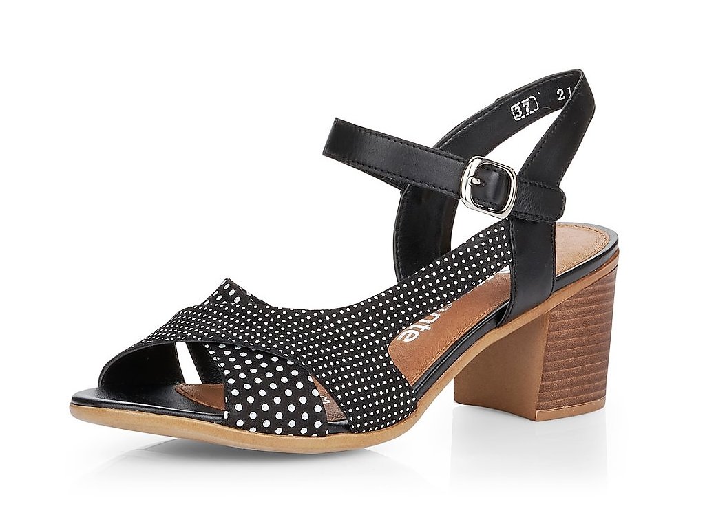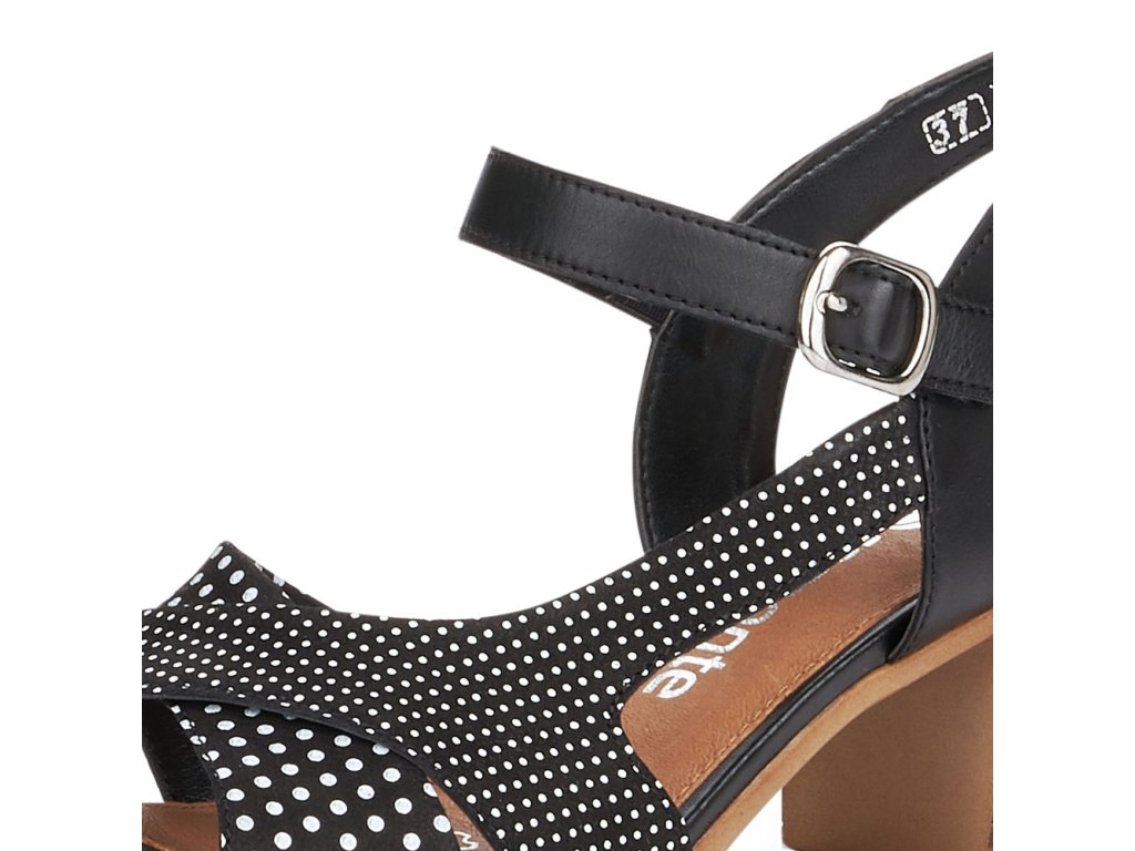Dámské letní boty REMONTE se zajímavě propletenými pásky přes nárt. Kombinace různě velkých bílých puntíků na černém podkladu. Velice elegantní letní bota na stabilním podpatku. Zapínání okolo kotníku na suchý zip.