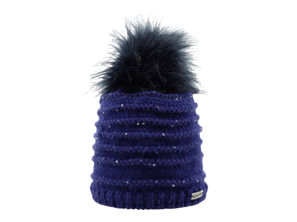 Uvnitř podšitá černým fleesem - cca 9 - 10 cm. Tmavě modrá barva, našité flitry. Bambule - imitace kožešiny. Našité kovové logo výrobce na straně.