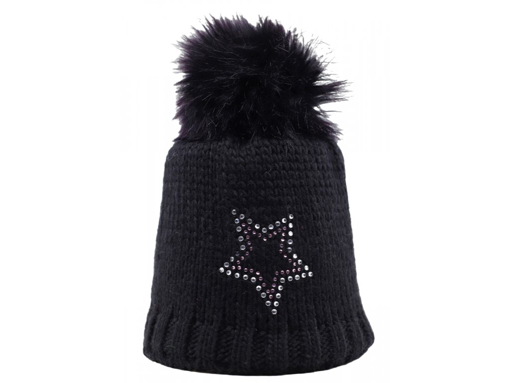 Uvnitř podšitá černým fleesem - cca 9 cm. Černá barva. Bambule - imitace kožešiny v černé barvě. Aplikace z kamínků.
