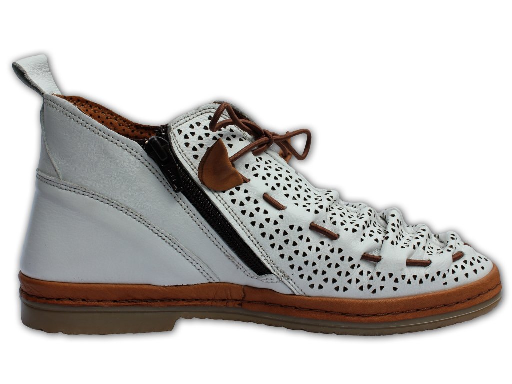 Máte rádi extravaganci? Nemáte chuť vyzkoušet tento neskutečně měkký a pohodlný model celoročních kotníkových bot od výrobce MANITU? Pro snadnější obouvání má tento model na vnitřní straně funkční zip. Zajímavé prosekané detaily. Kombinace bílé a hnědé barvy.