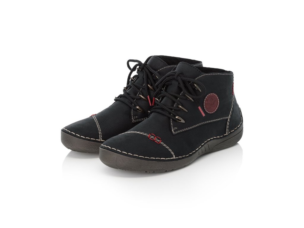 Pohodlné kotníkové dámské boty s dostatečně širokou špičkou a s ozdobnými prvky okolo tkaniček. Na vnější straně našité logo výrobce RIEKER. Černá barva s červenými detaily. Výrazné prošívání v přírodní barvě. Zatepleno černým chlupem.