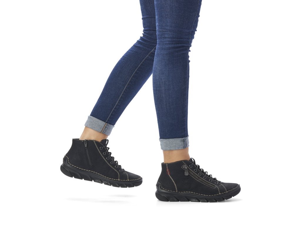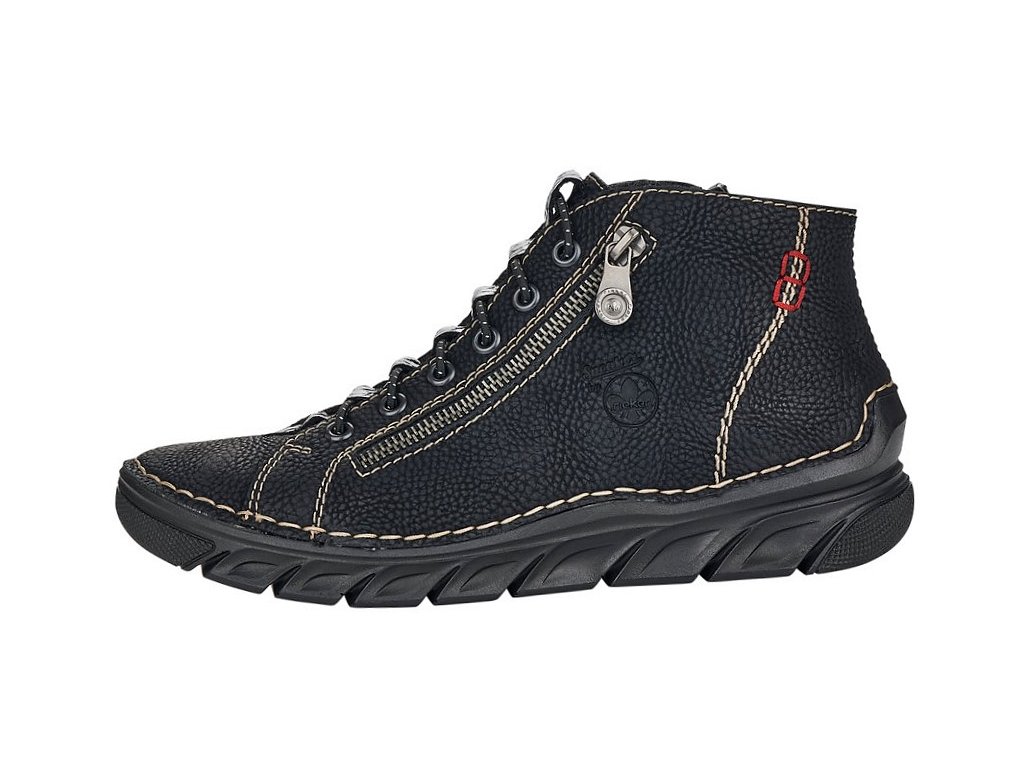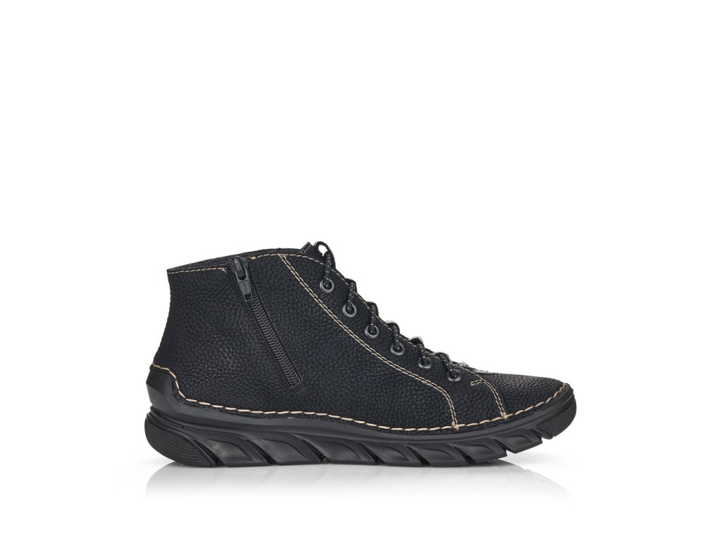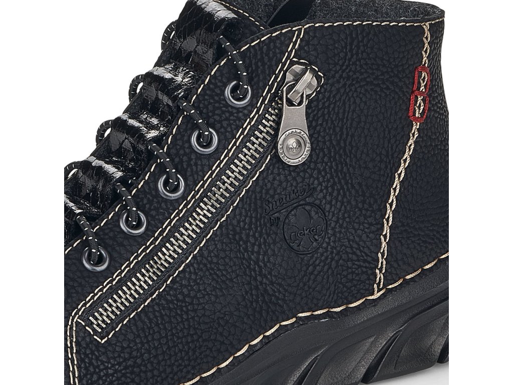 Pohodlné kotníkové dámské boty s dostatečně širokou a kulatou špičkou, s ozdobnými prvky okolo tkaniček a funkčním zipem na vnitřní straně. Na vnější straně vytlačené logo výrobce RIEKER. Zatepleno fleesem, zip na vnější straně je ozdobný, funkční je pouze zip na vnitřní straně. Výrazné prošití v přírodní barvě, červené detaily. Masivnější podešev.