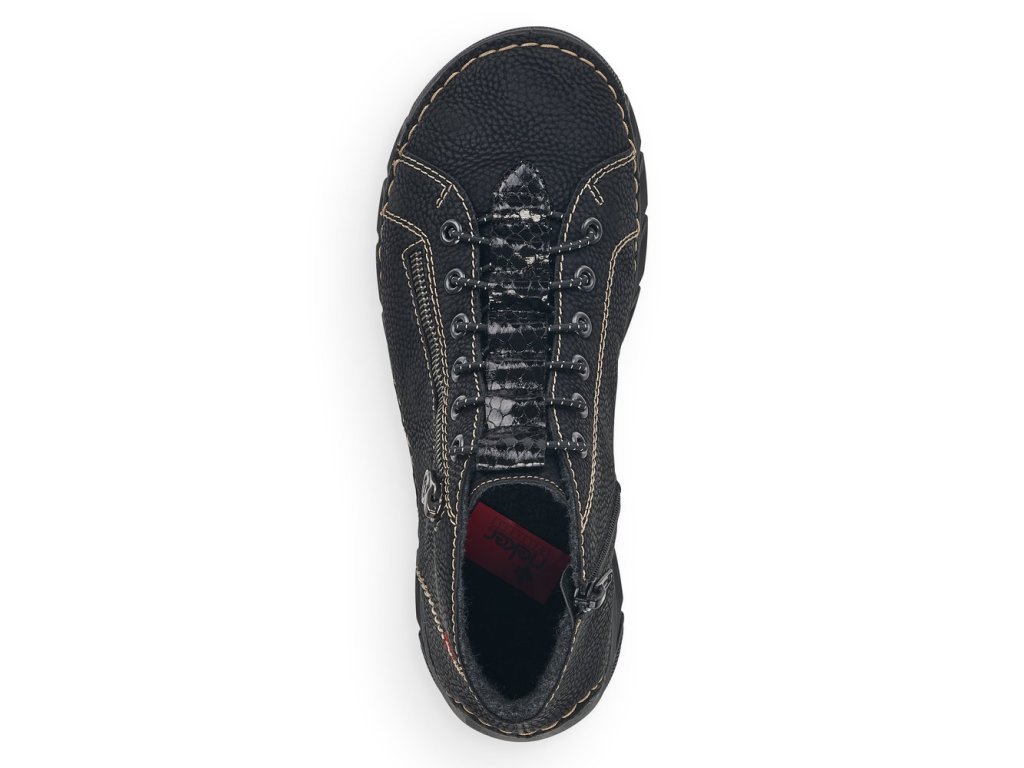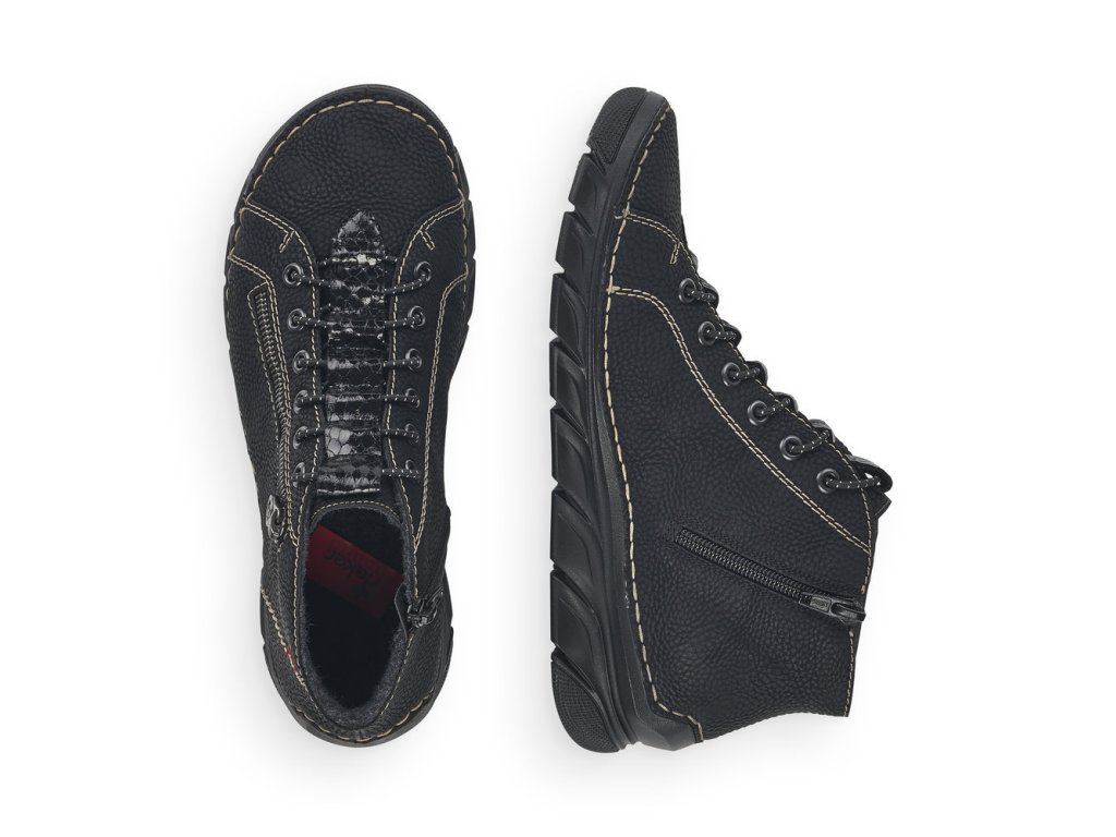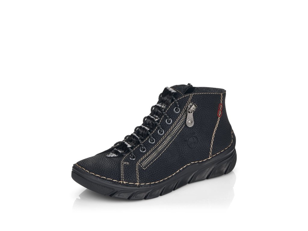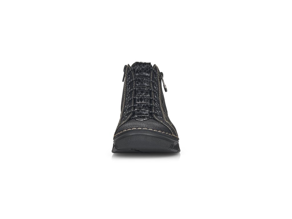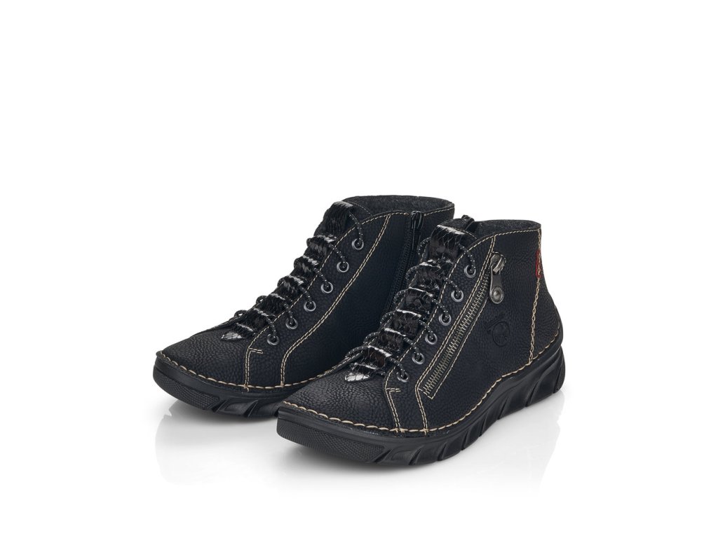 Pohodlné kotníkové dámské boty s dostatečně širokou a kulatou špičkou, s ozdobnými prvky okolo tkaniček a funkčním zipem na vnitřní straně. Na vnější straně vytlačené logo výrobce RIEKER. Zatepleno fleesem, zip na vnější straně je ozdobný, funkční je pouze zip na vnitřní straně. Výrazné prošití v přírodní barvě, červené detaily. Masivnější podešev.
