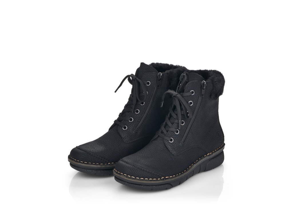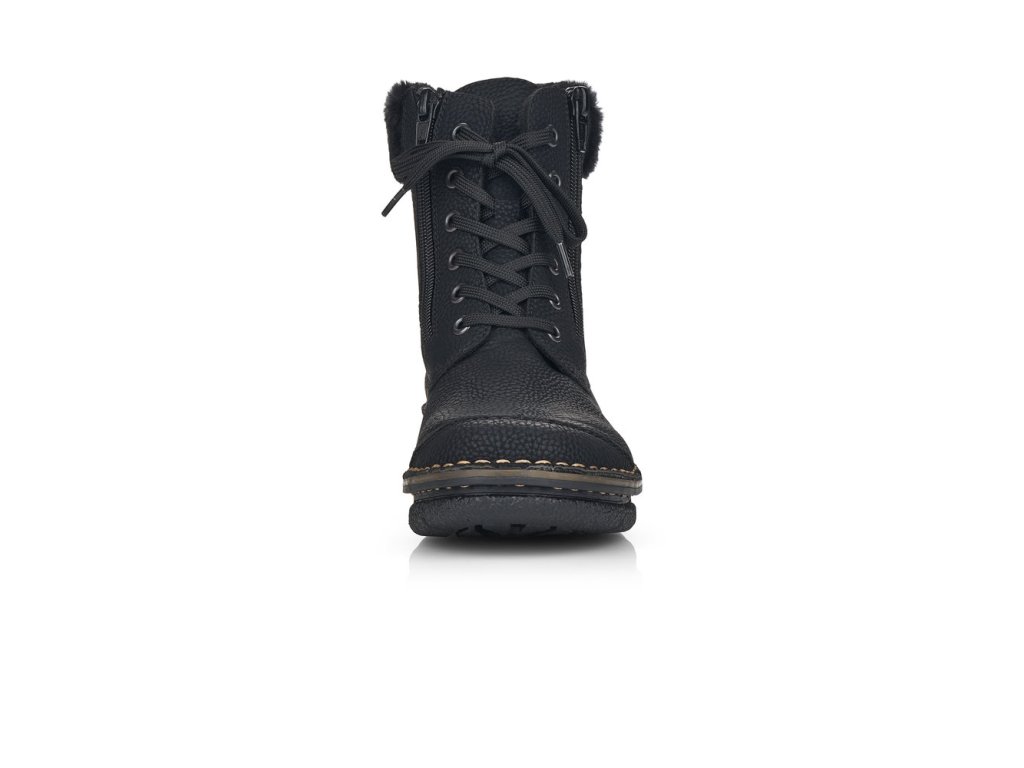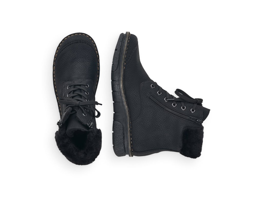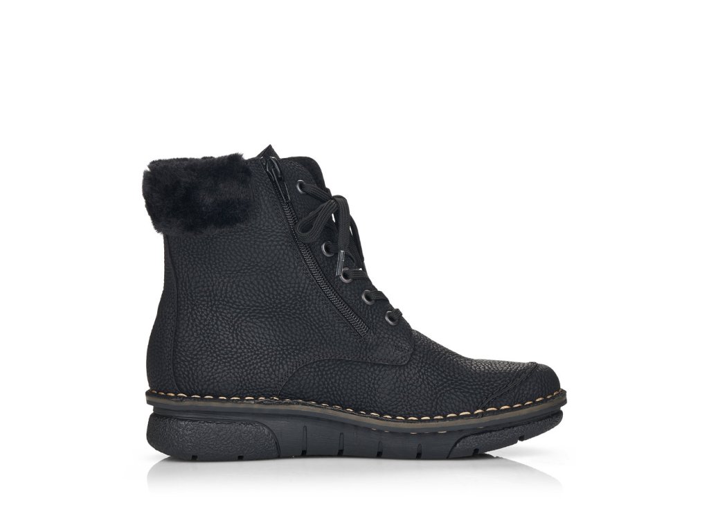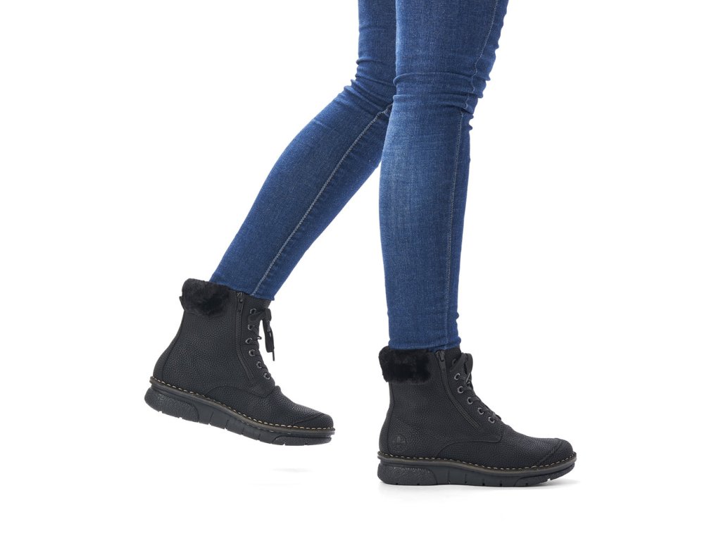 Pohodlné kotníkové dámské boty se šněrováním na tkaničky a s funkčními dvěma zipy na vnitřní i vnější straně. Tento model od výrobce RIEKER je v černé barvě na vyšší podešvi - výška pod patou je cca 4 cm. Zateplené černým chlupem. Výška celé boty je cca 18 cm.