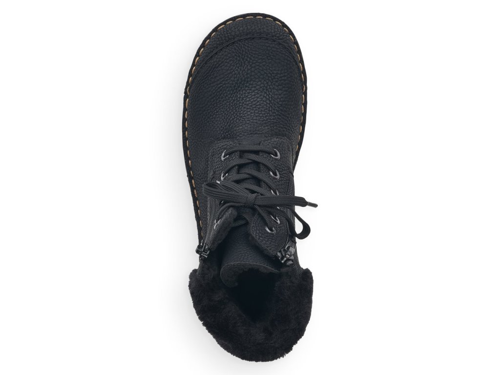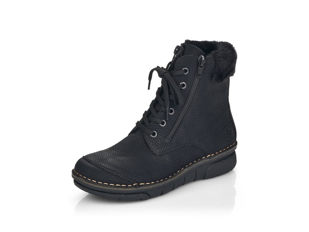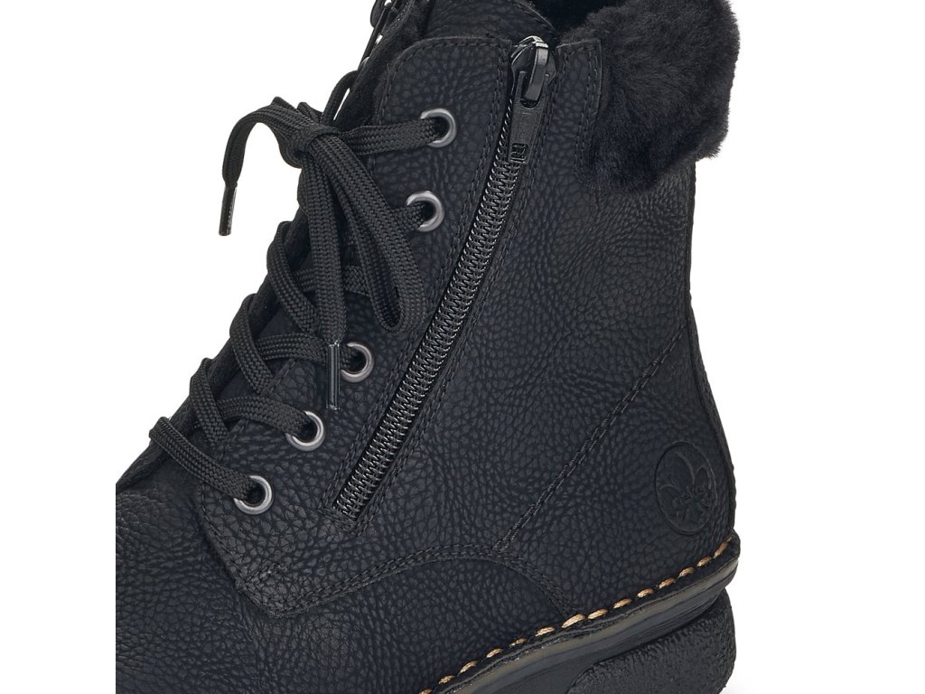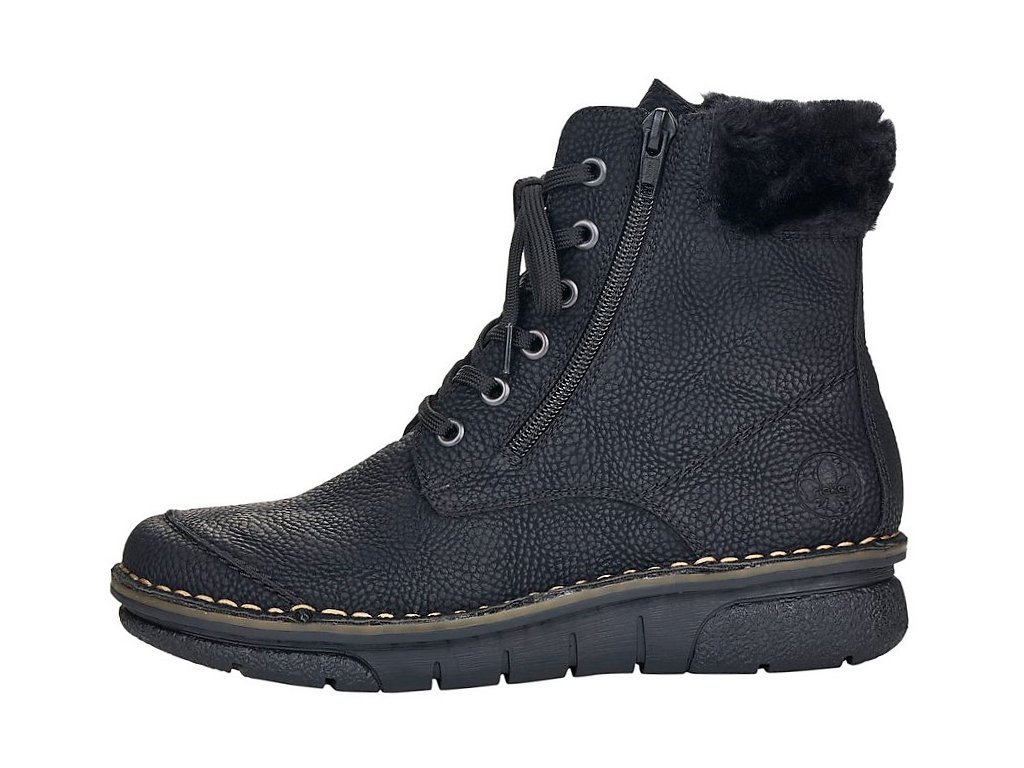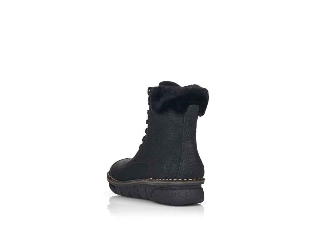 Pohodlné kotníkové dámské boty se šněrováním na tkaničky a s funkčními dvěma zipy na vnitřní i vnější straně. Tento model od výrobce RIEKER je v černé barvě na vyšší podešvi - výška pod patou je cca 4 cm. Zateplené černým chlupem. Výška celé boty je cca 18 cm.
