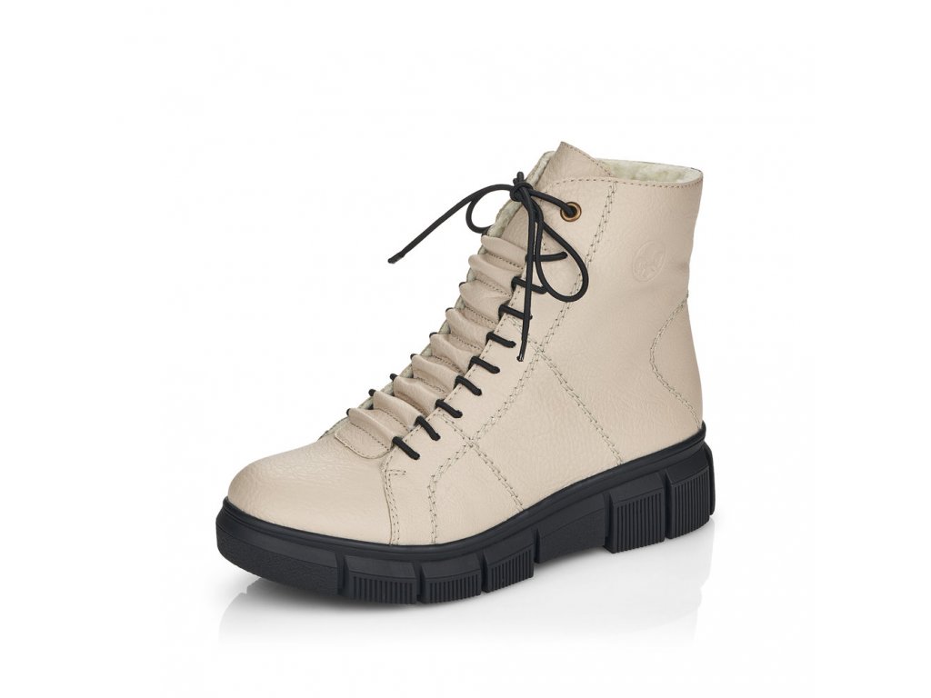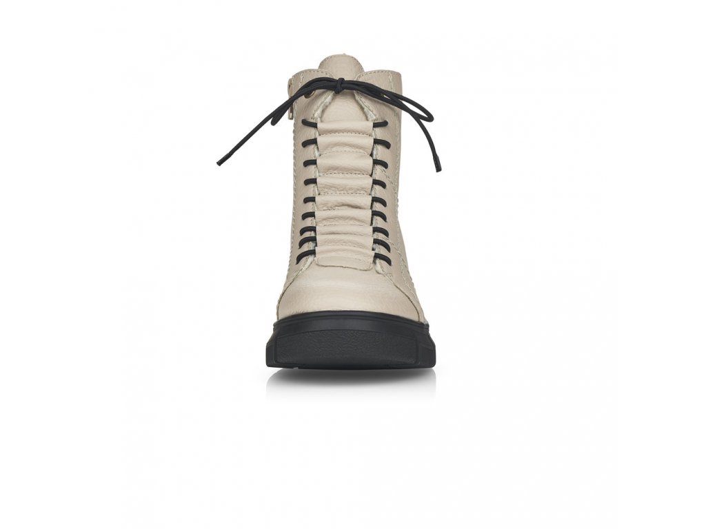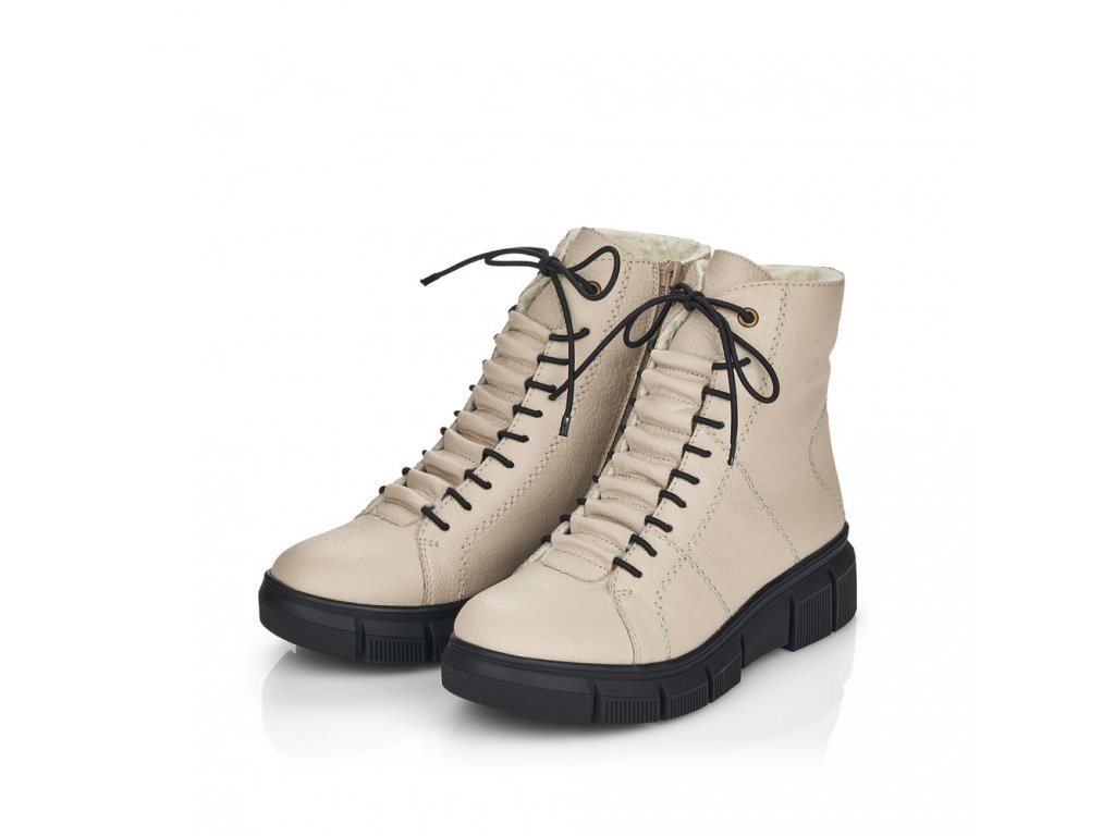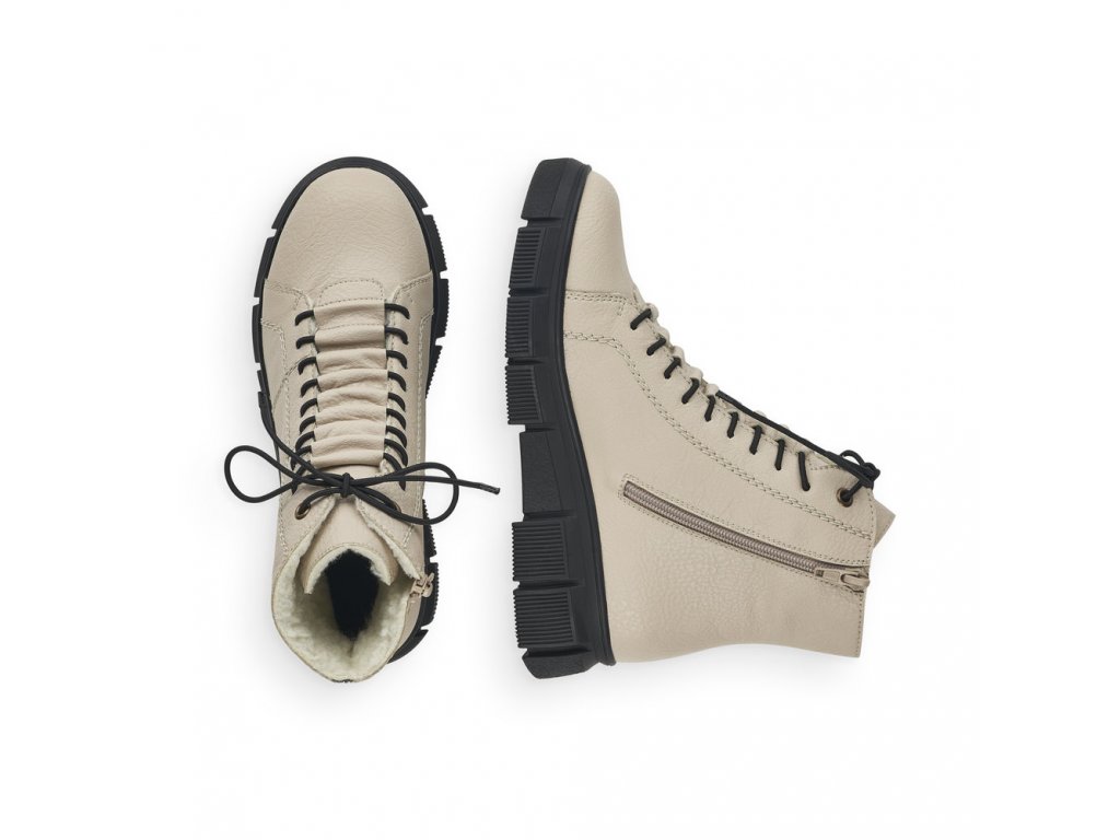 Pohodlné dámské kotníkové boty RIEKER se šněrováním na tkaničky a s funkčním zipem na vnitřní straně. Tento model od výrobce RIEKER je v béžové barvě na vyšší podešvi - výška pod patou je cca 4,5 cm. Zateplené světlým chlupem. Výška celé boty je cca 17 cm. Zajímavě řešené propletení tkaniček.