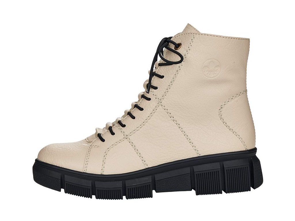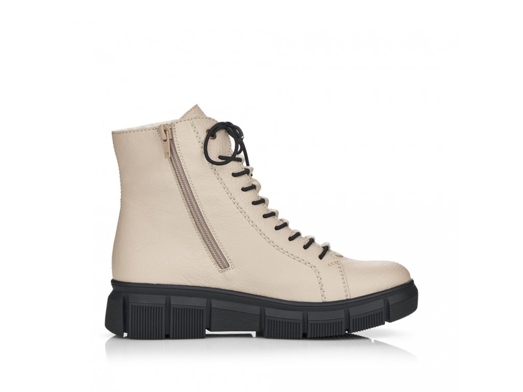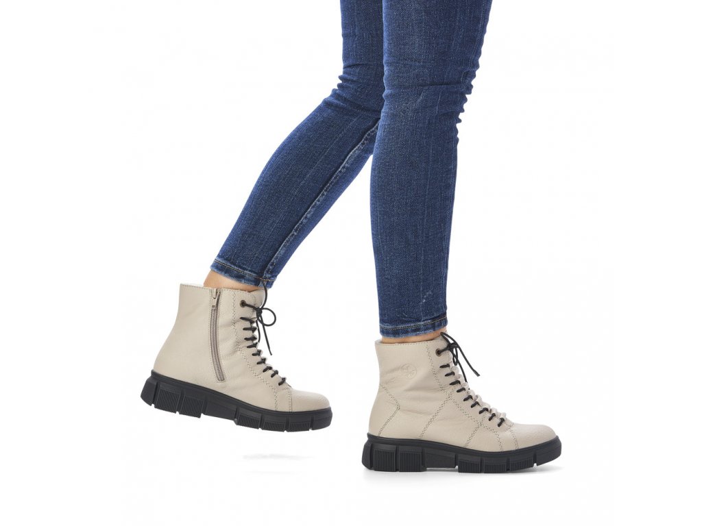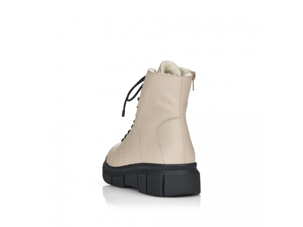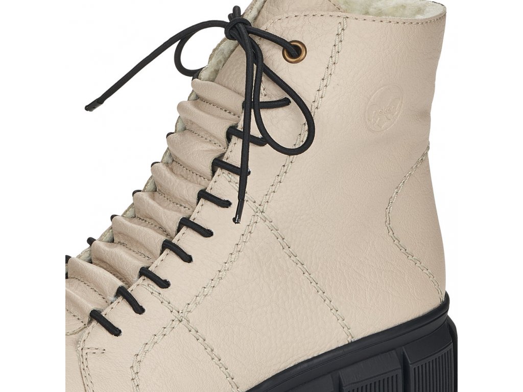 Pohodlné dámské kotníkové boty RIEKER se šněrováním na tkaničky a s funkčním zipem na vnitřní straně. Tento model od výrobce RIEKER je v béžové barvě na vyšší podešvi - výška pod patou je cca 4,5 cm. Zateplené světlým chlupem. Výška celé boty je cca 17 cm. Zajímavě řešené propletení tkaniček.
