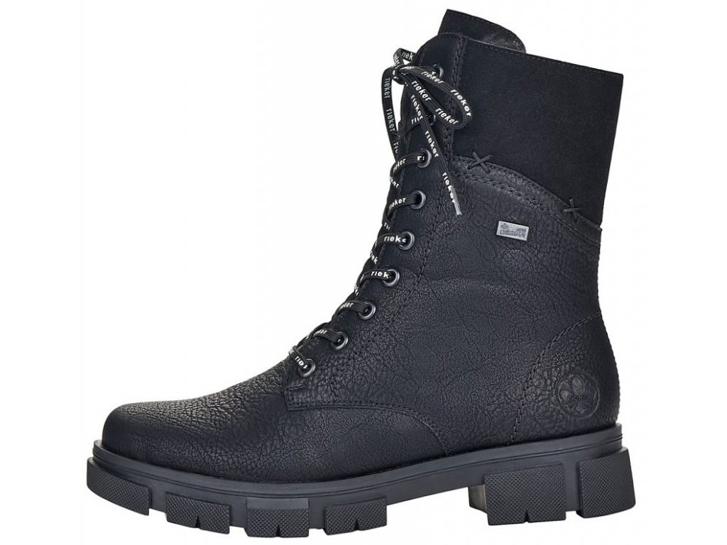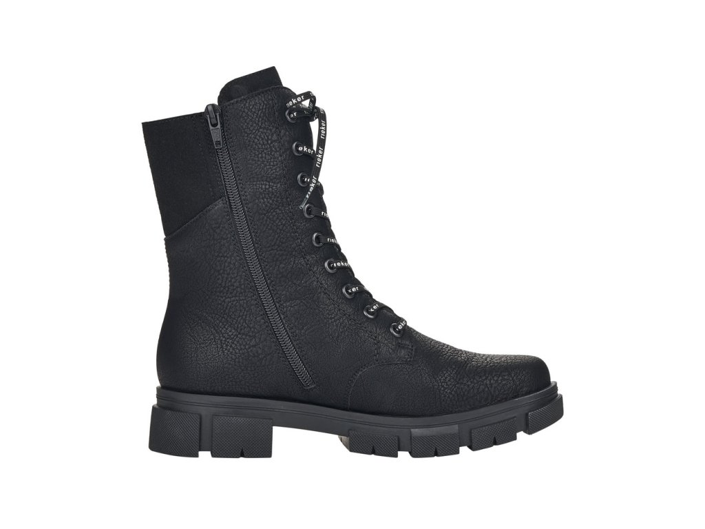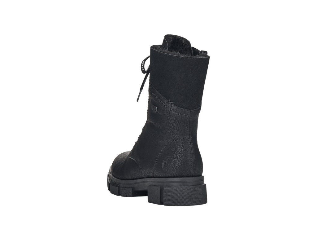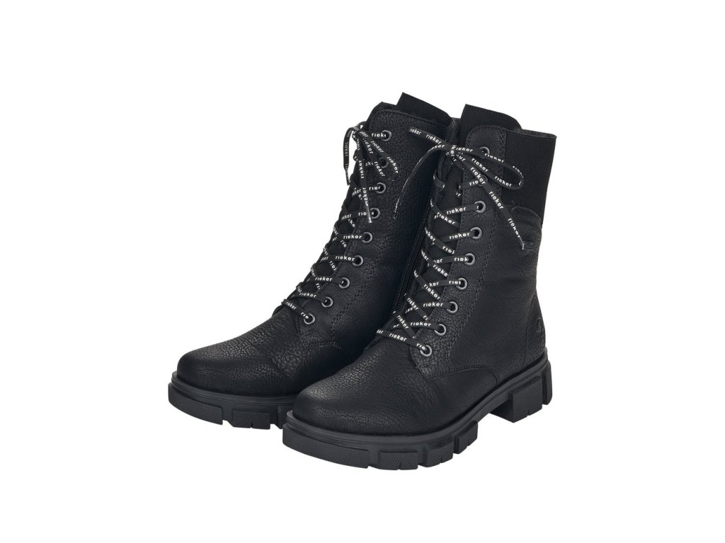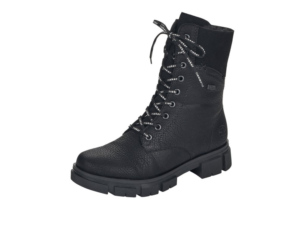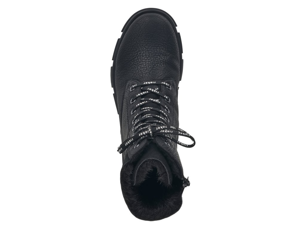 Pohodlné zimní boty RIEKER s kulatou a dostatečně širokou špičkou. Vyšší, mohutnější podešev, na vnitřní straně funkční zip pro snadnější obouvání, zatepleno černým delším chlupem, prošití v černé barvě, černé tkaničky s bílým nápisem RIEKER. Membrána RIEKER TEX.