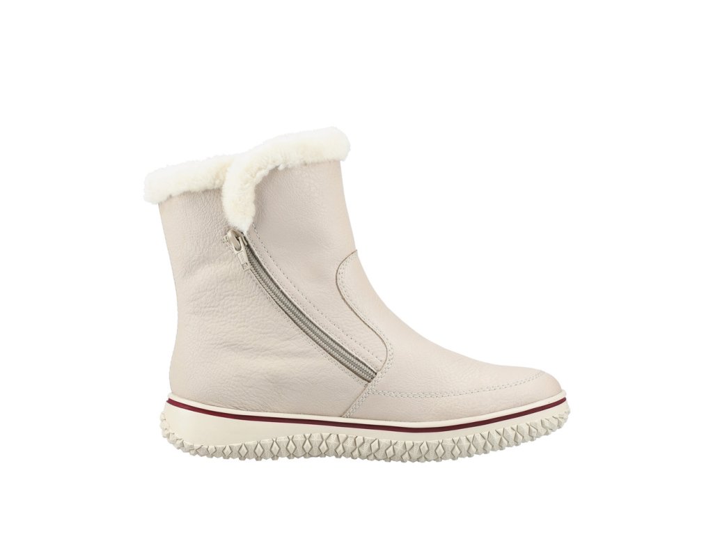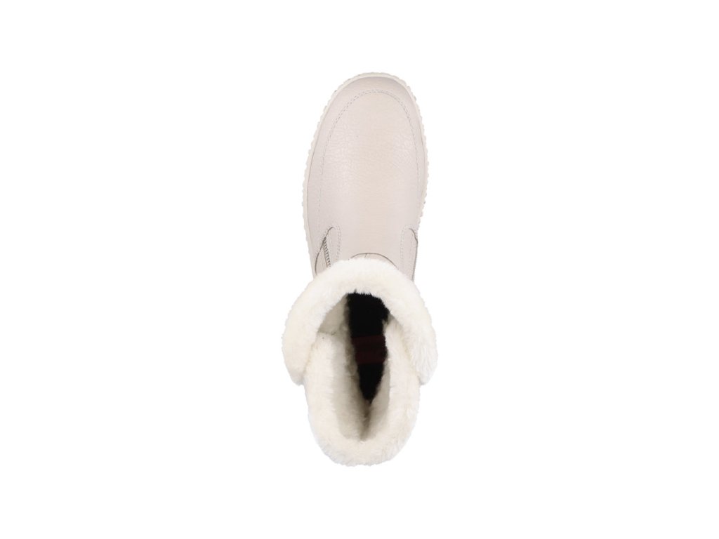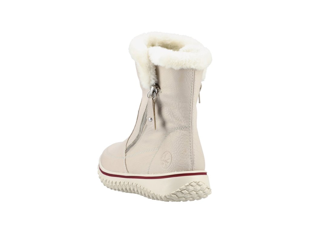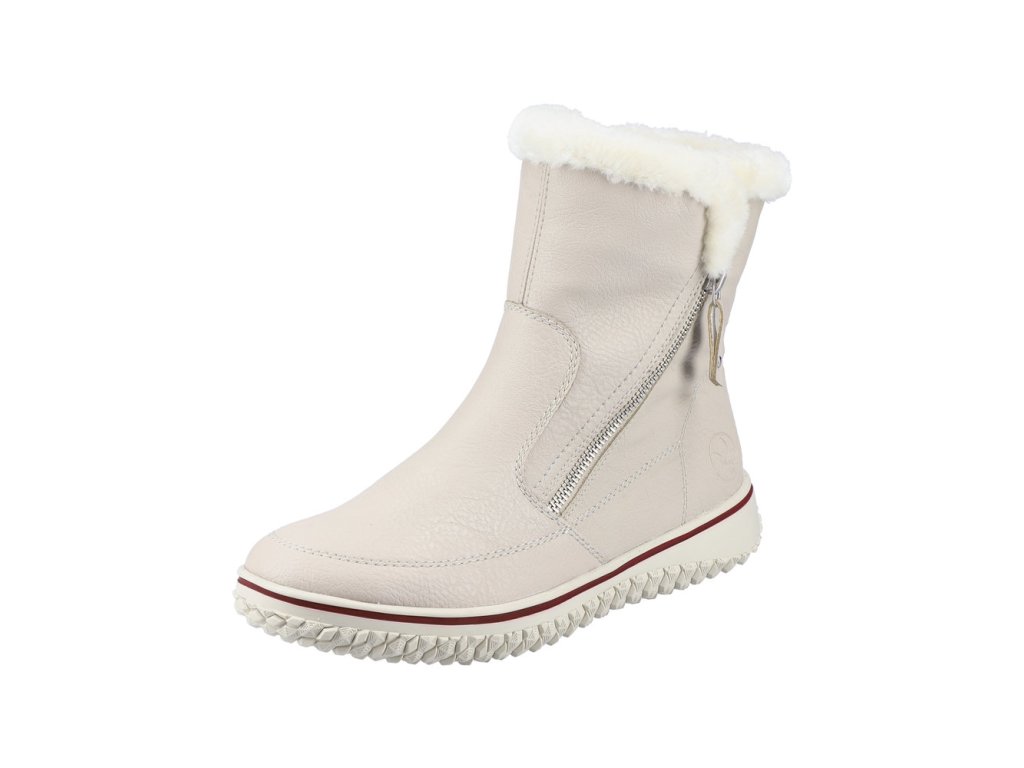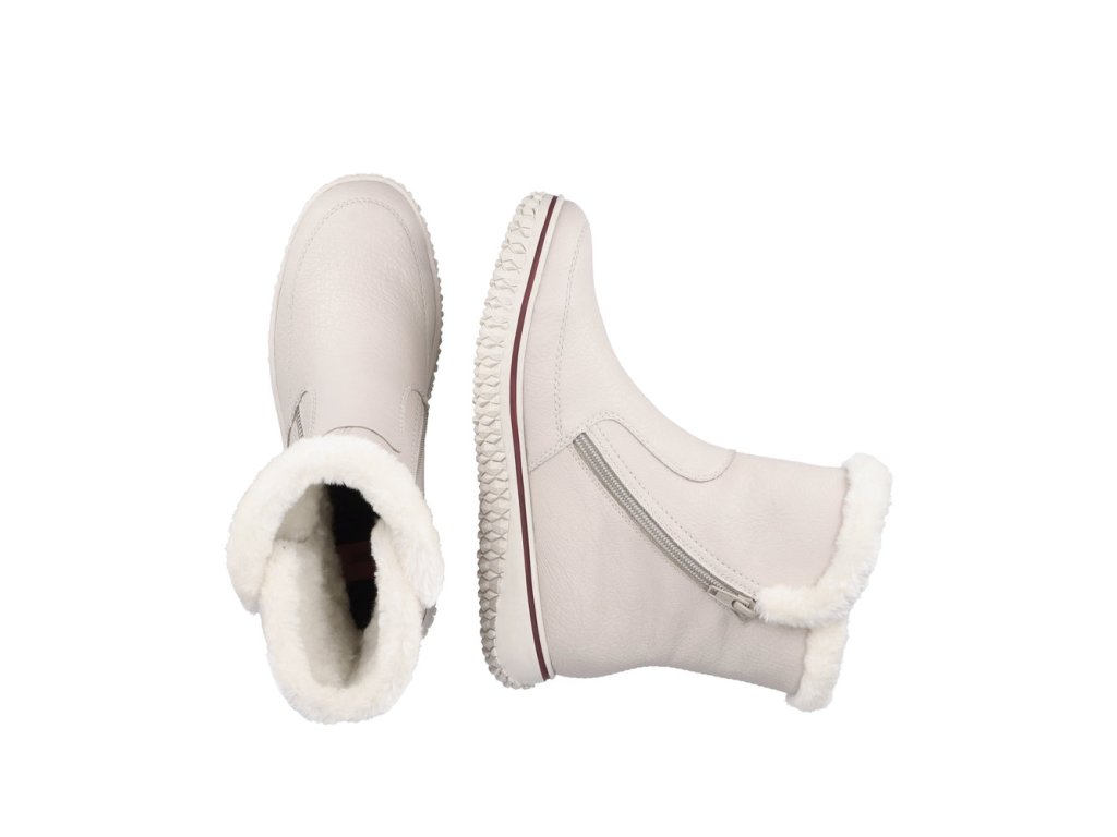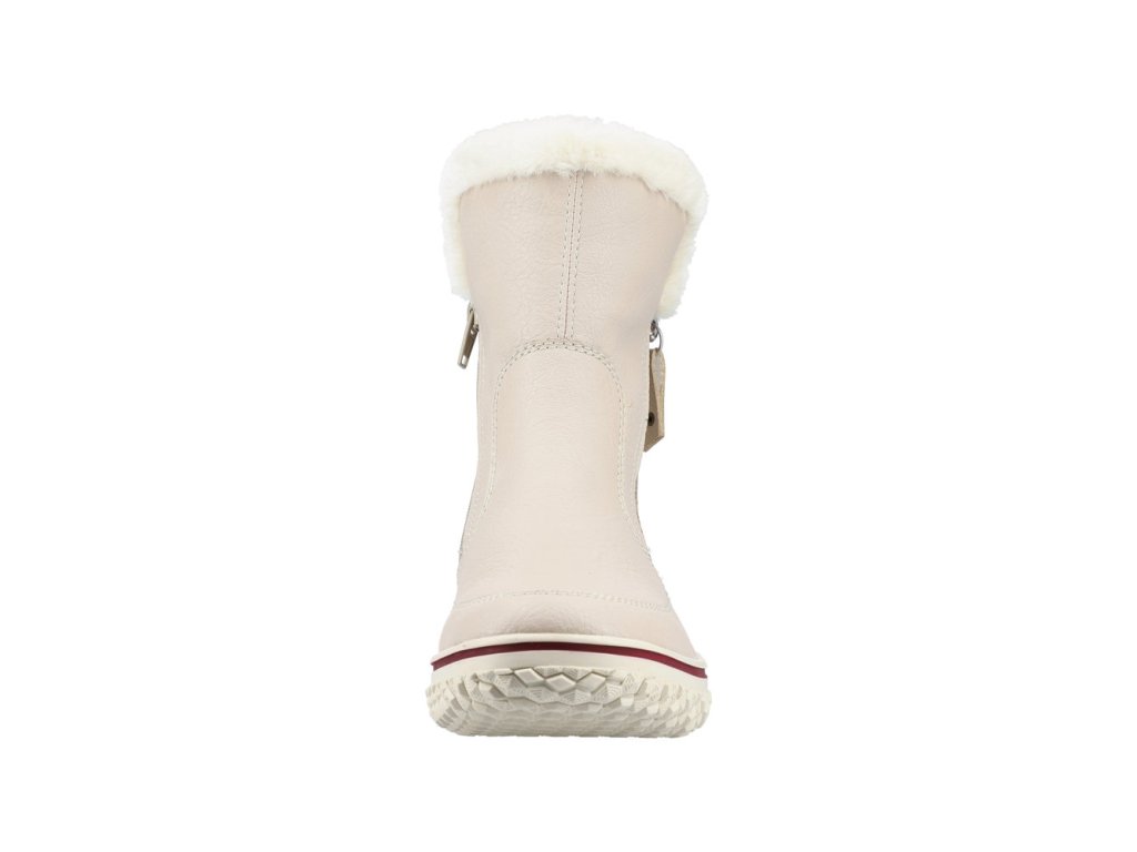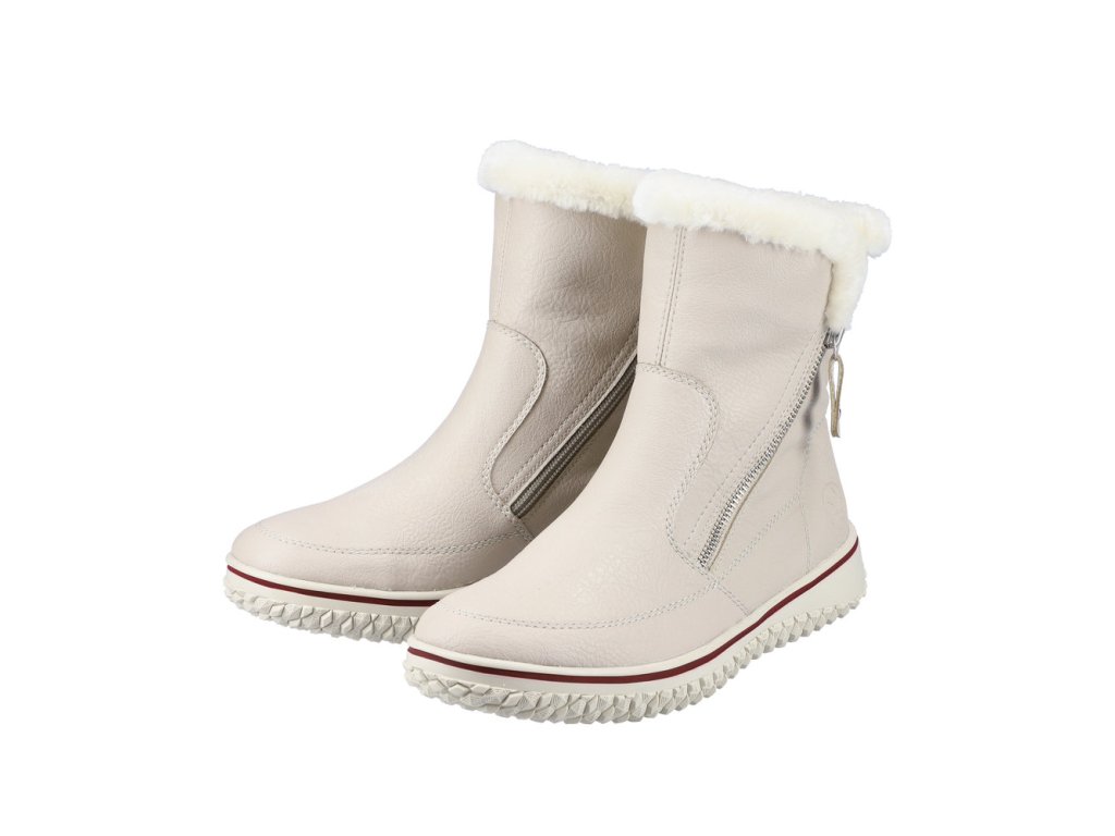 Pohodlné kotníkové dámské boty se zajímavě řešeným zapínáním - 2 funkční zipy pro snadnější prozutí. Tento model od výrobce RIEKER je v přírodní/béžové barvě a nižším klínku - výška pod patou je cca 3 cm. Zateplené světlým chlupem. Výška celé boty je cca 18 cm.