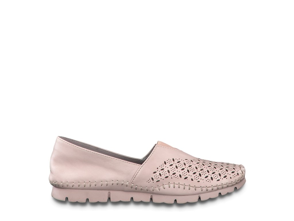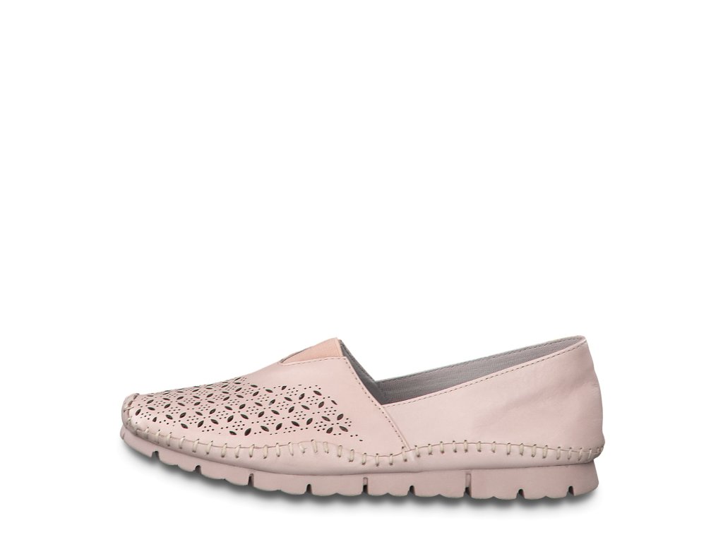 Velice měkké, ohebné a odlehčené kožené mokasíny JANA v růžové barvě s perforací a výraznějším prošitím. Na nártu je vložená guma pro snadnější obouvání. Šířka H.