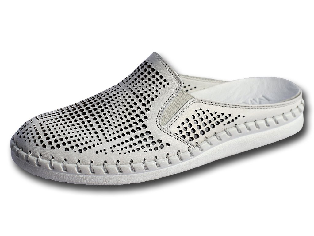 Hledáte pohodlné, celokožené pantofle s vyměkčenou stélkou? Co byste říkali na tento model od výrobce MAGO v bílé barvě s perforovaným svrškem?