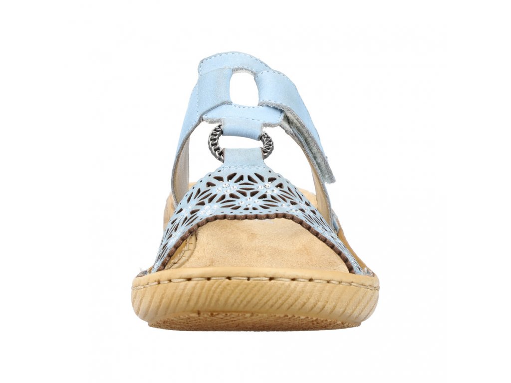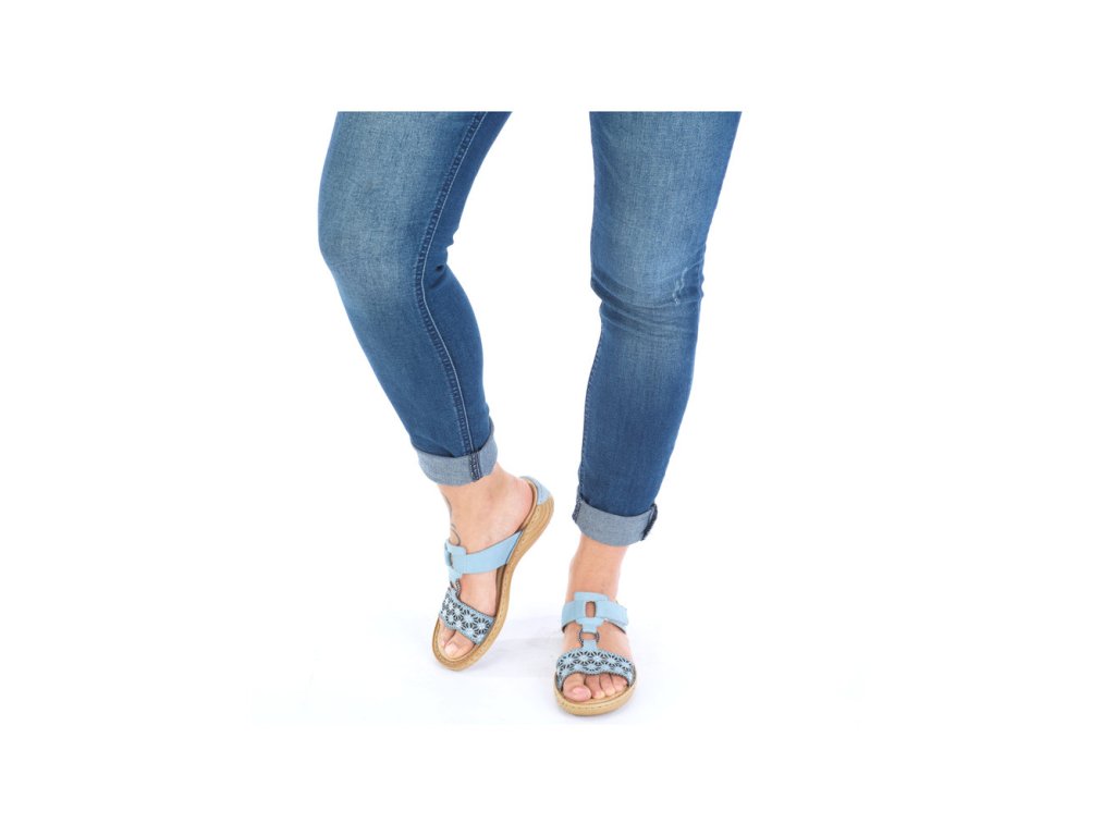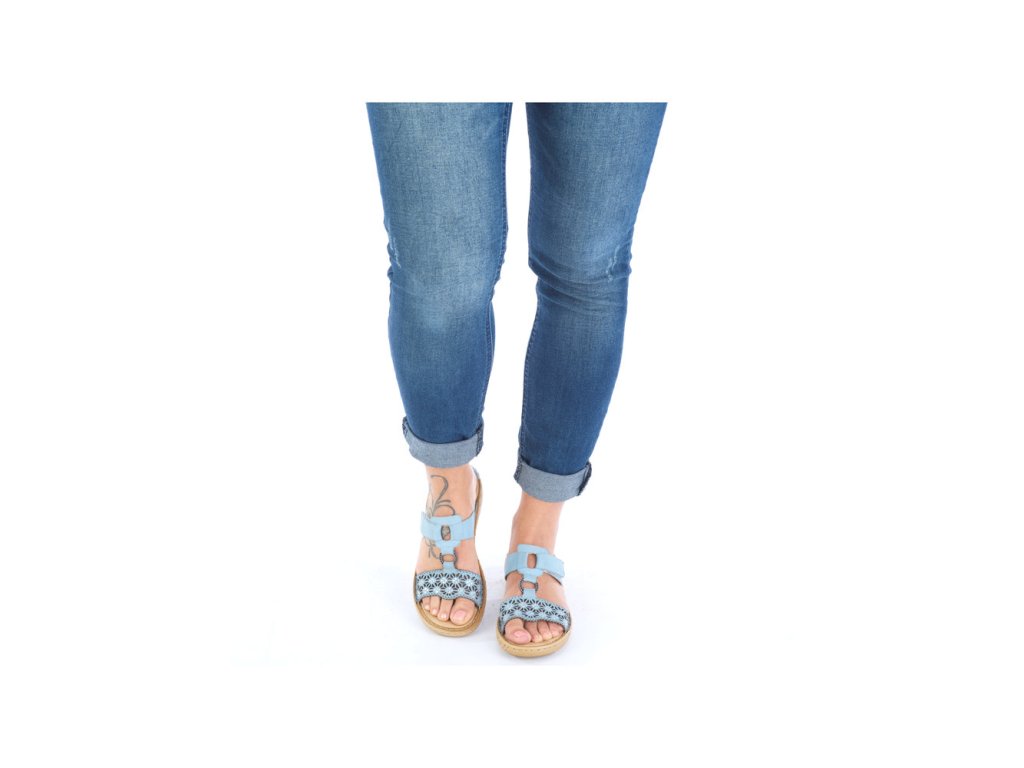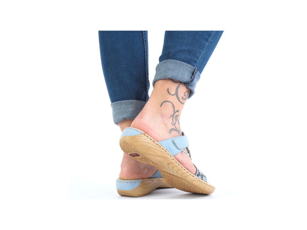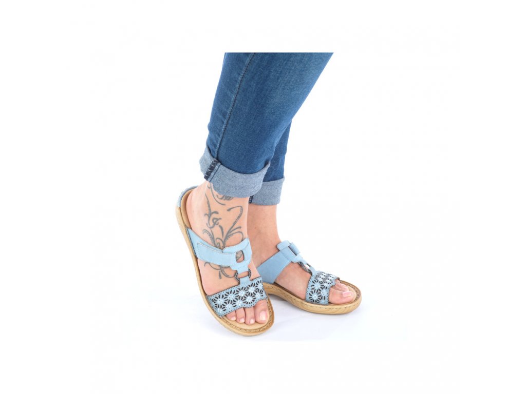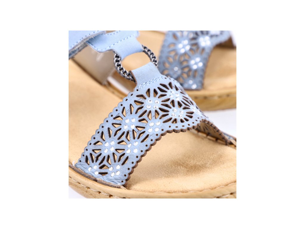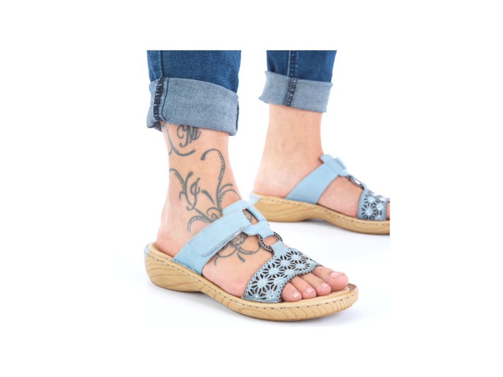 Právě jste našli lety prověřenou klasiku. Tyto dámské letní pantofle ve světle modré barvě jsou jedny z nejprodávanějších od výrobce RIEKER. Pásek přes nárt je se zapínáním na suchý zip. Přední pásek má ozdoby z korálků + jemnou perforaci ve tvaru kytiček. Komfort Vaší chůze bude zajišťovat vyměkčená stélka. Kožené pásky.