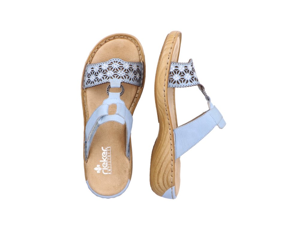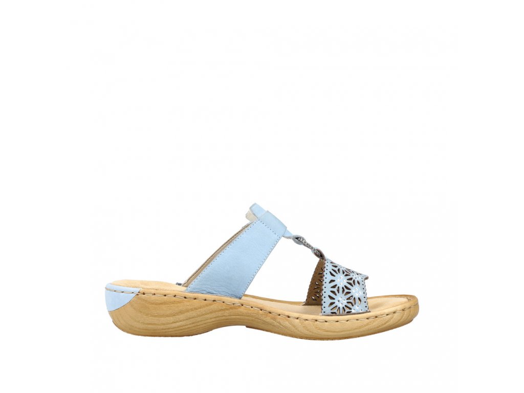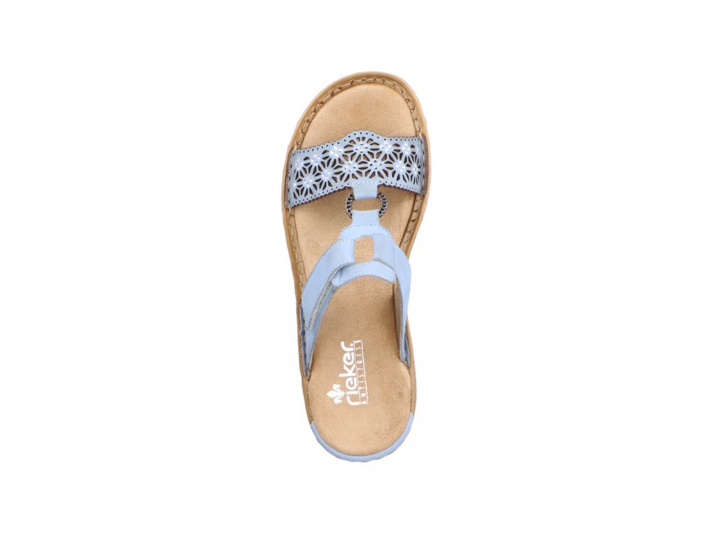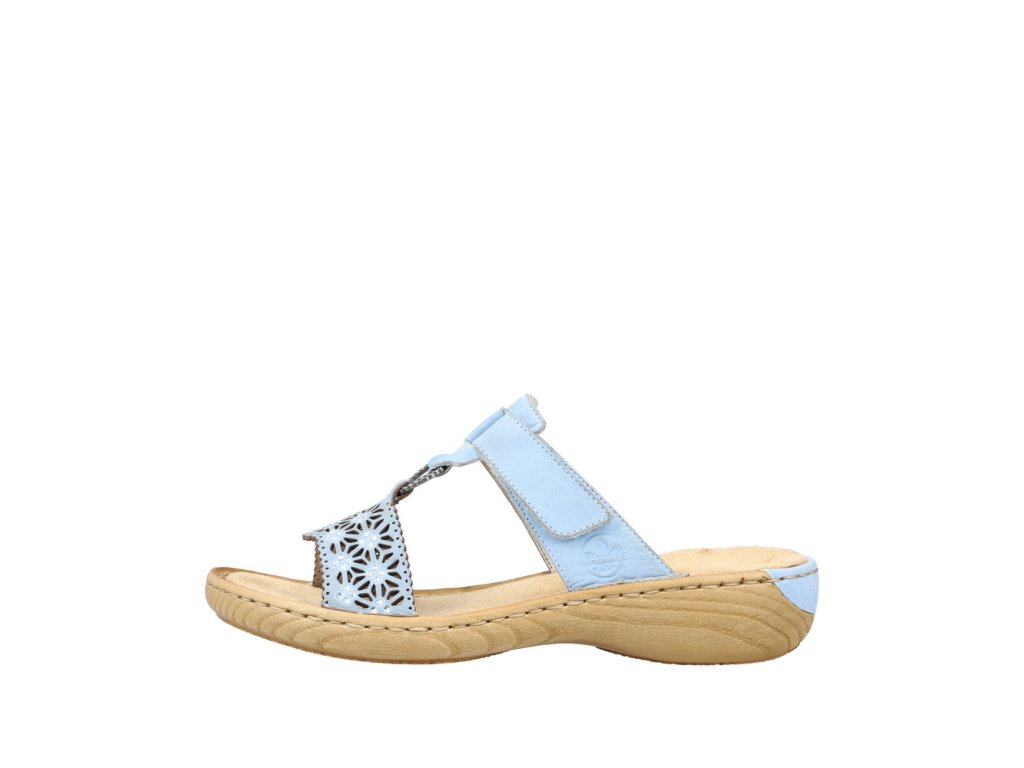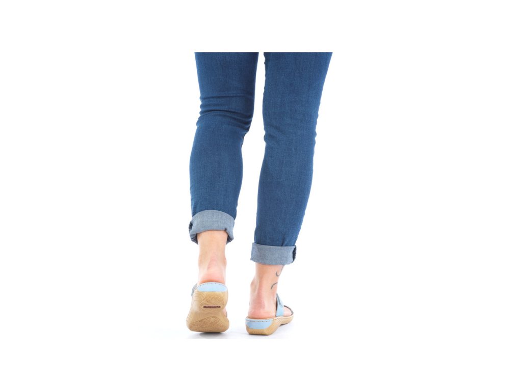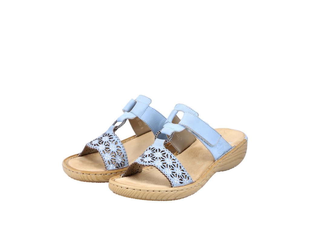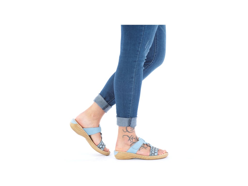 Právě jste našli lety prověřenou klasiku. Tyto dámské letní pantofle ve světle modré barvě jsou jedny z nejprodávanějších od výrobce RIEKER. Pásek přes nárt je se zapínáním na suchý zip. Přední pásek má ozdoby z korálků + jemnou perforaci ve tvaru kytiček. Komfort Vaší chůze bude zajišťovat vyměkčená stélka. Kožené pásky.