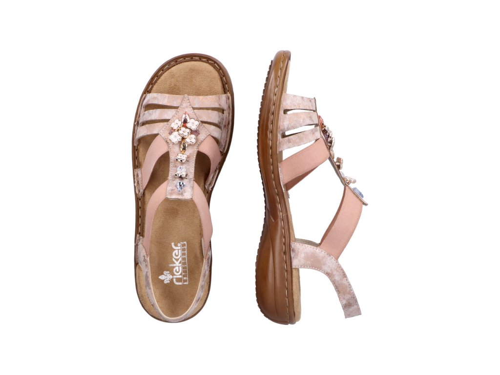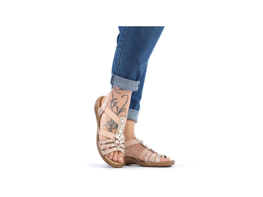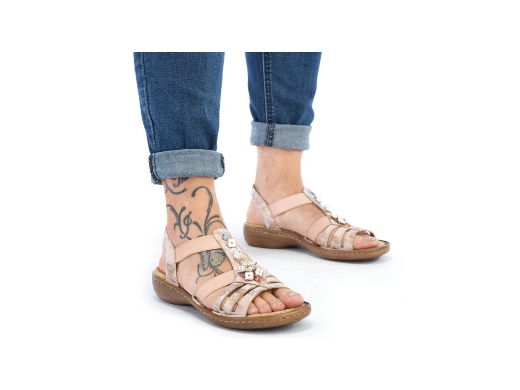 Dámské letní sandále RIEKER s velice elegantním středovým páskem, který je ozdobený kytičkami. Jeden z nejoblíbenějších letních modelů, který snadno obujete díky velice pružným gumičkám. Výška podpatku je cca 3,5 cm.