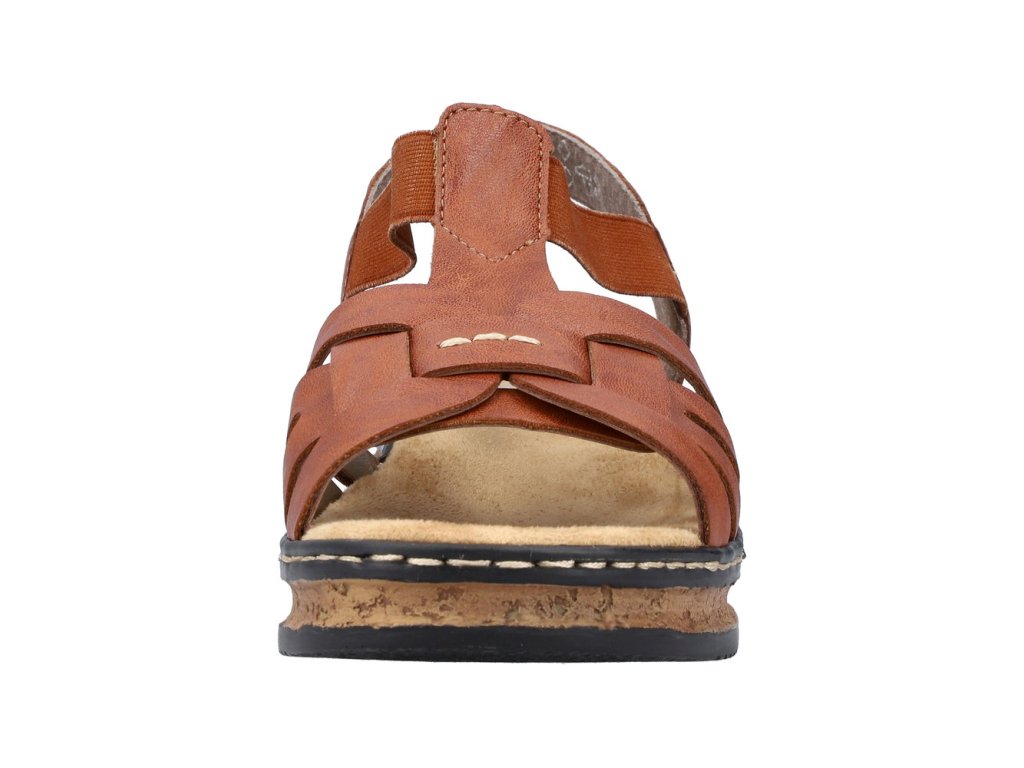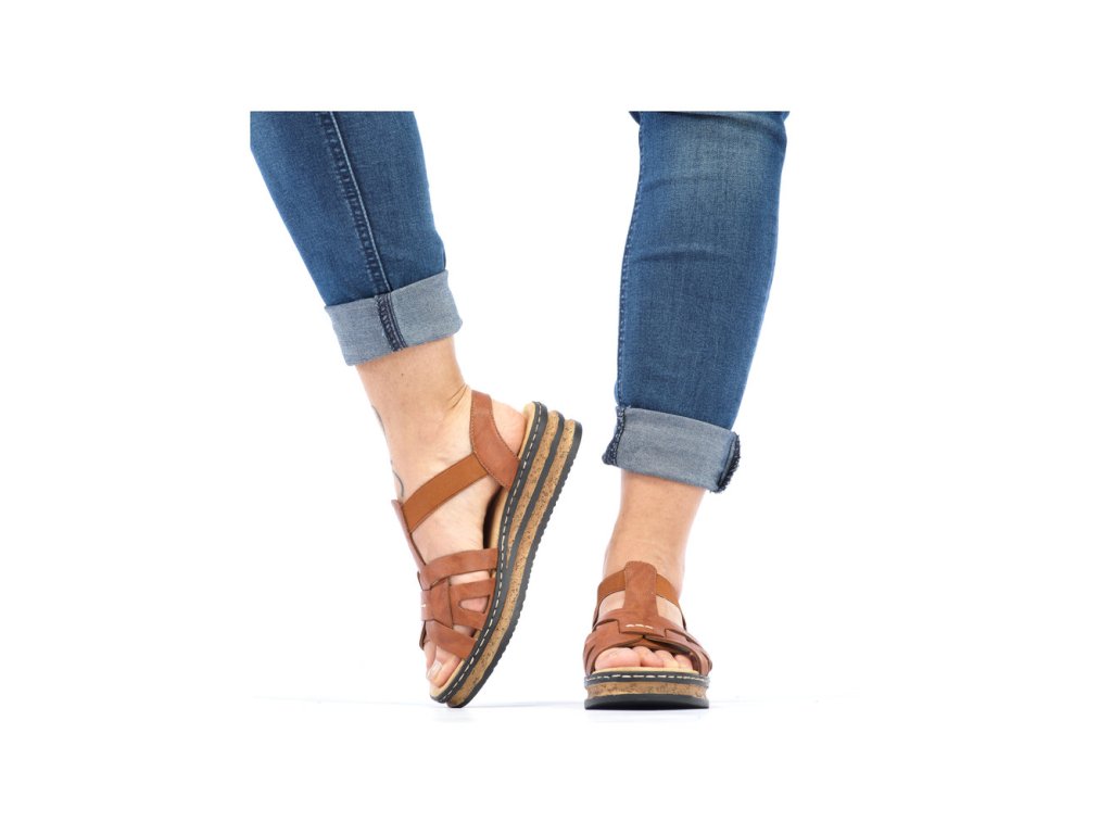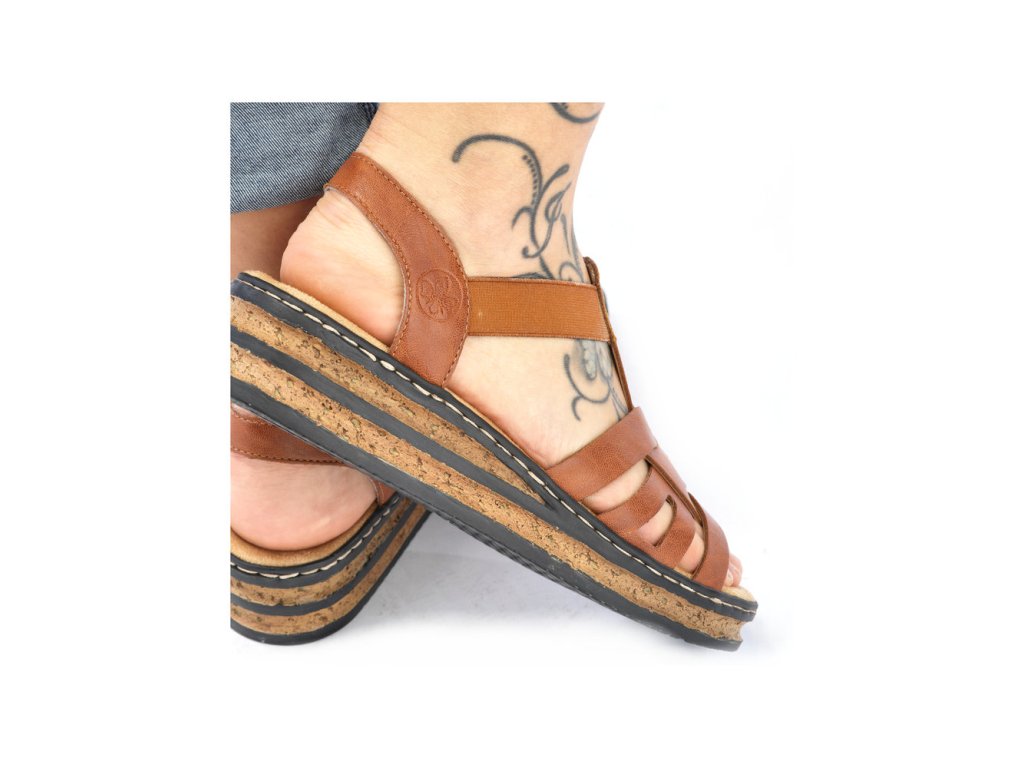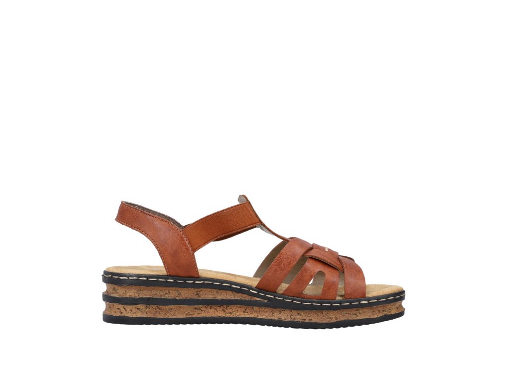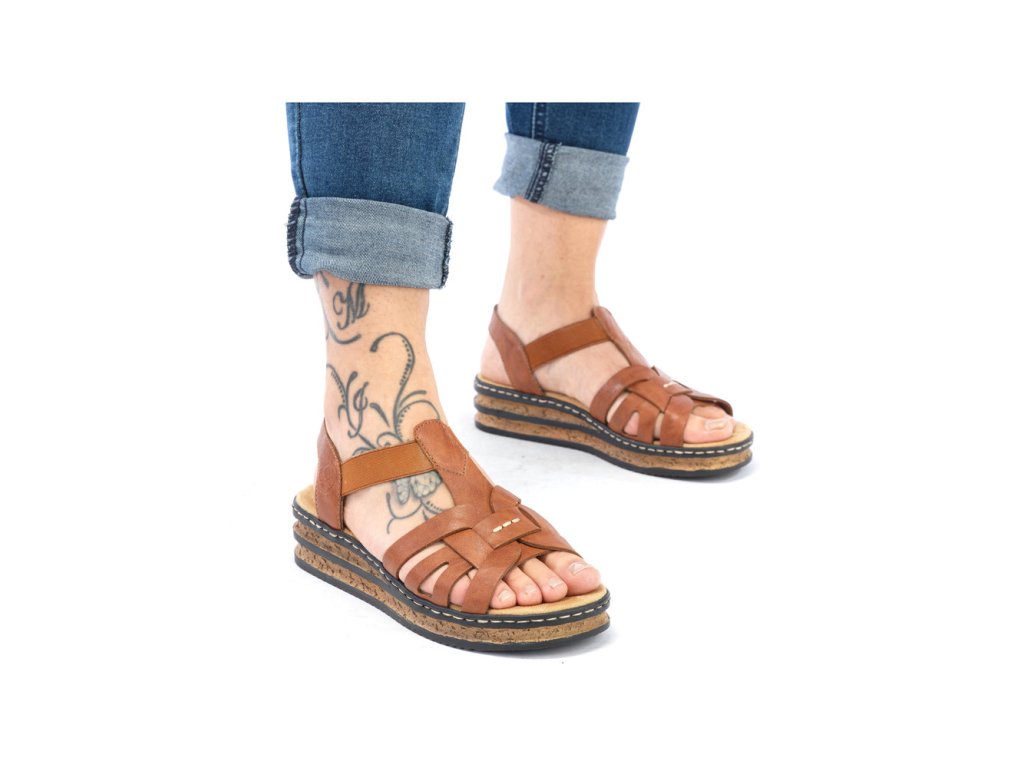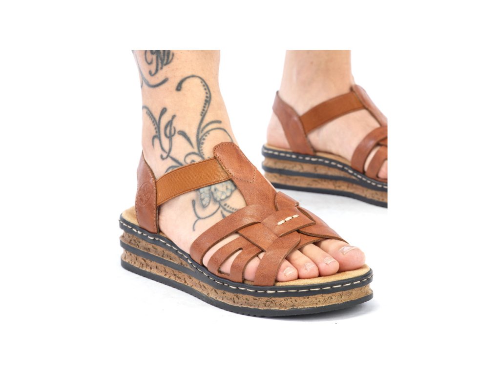 Dámské letní nazouvací sandále RIEKER s velice zajímavě propletenými pásky na nártu. Jeden z nejoblíbenějších letních modelů, který snadno obujete díky velice pružným gumičkám. Výška platformy pod prsty je cca 2 cm, pod patou cca 4 cm. Kulatá špička. Univerzání hnědá barva, která se bude hodit ke každému oblečení.