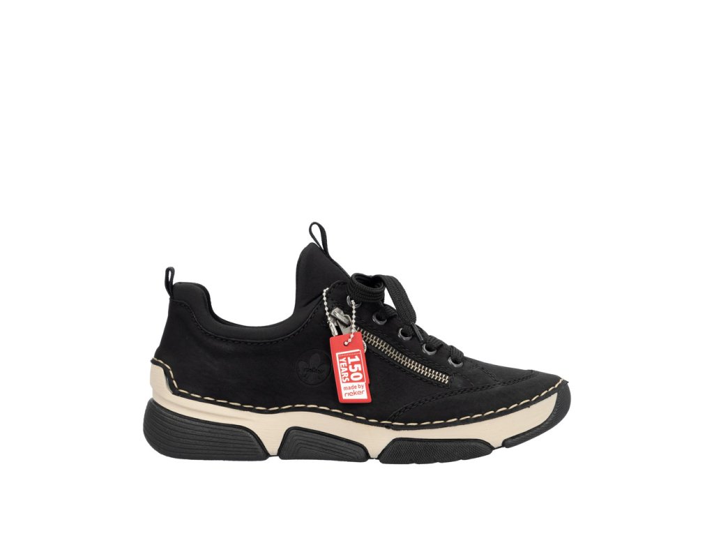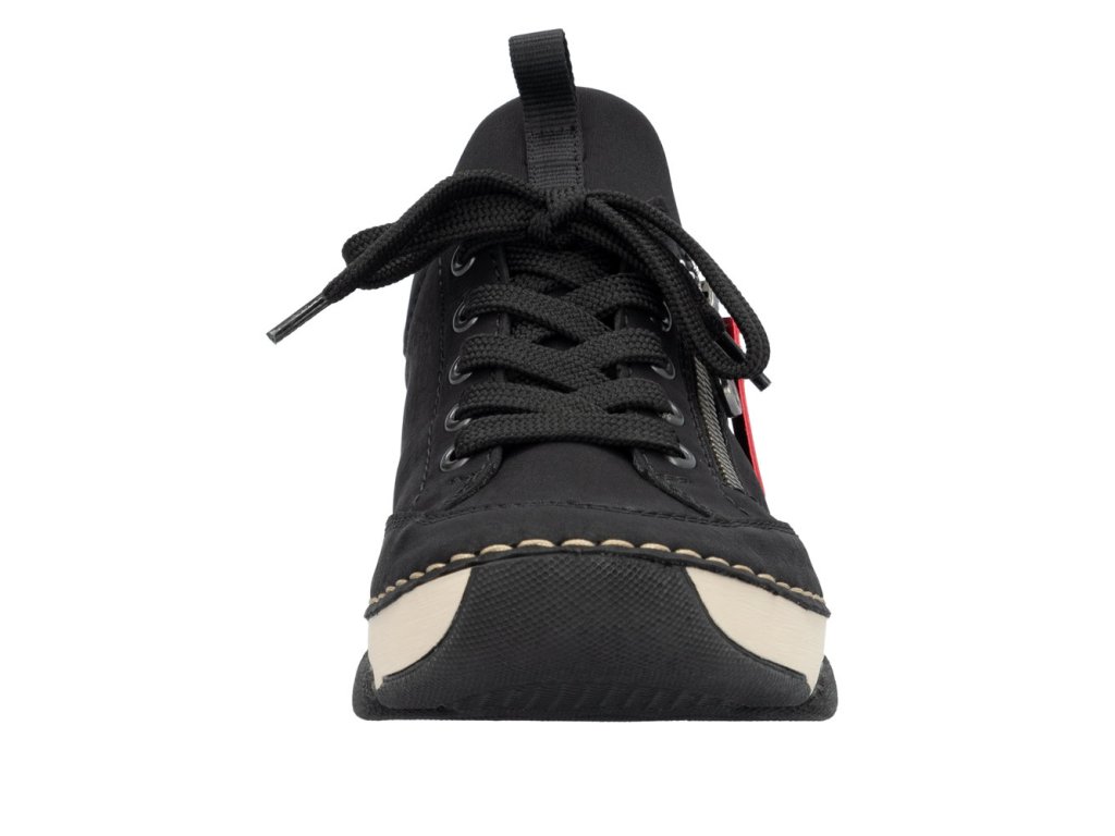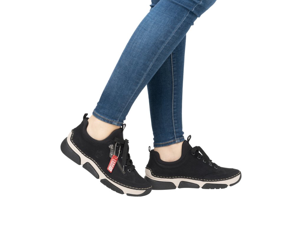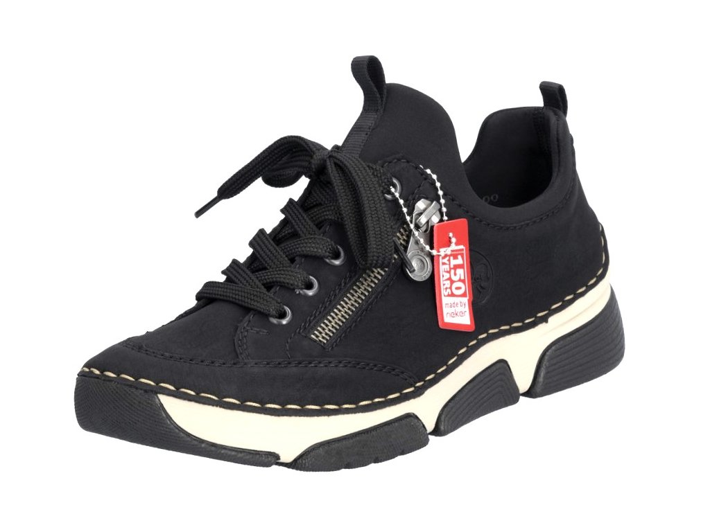 Nosíte ráda tenisky? Nemáte chuť vyzkoušet tento pohodlný model od výrobce RIEKER? Zajímavé tenisky v univerzální černé barvě s tkaničkami. Mírně zvýšená pata - cca 3,5 cm. Nazouvací model, tkaničky a ozdobný zip. Sneaker by RIEKER - dvojbarevná podešev s výrazným prošitím v přírodní barvě.