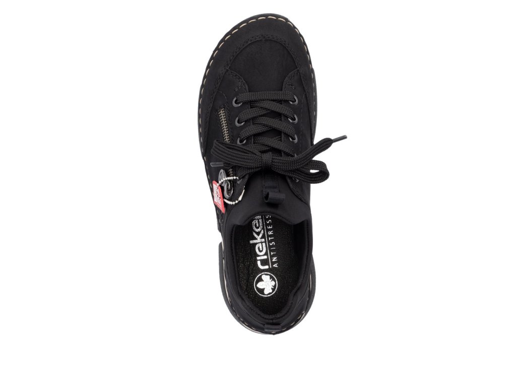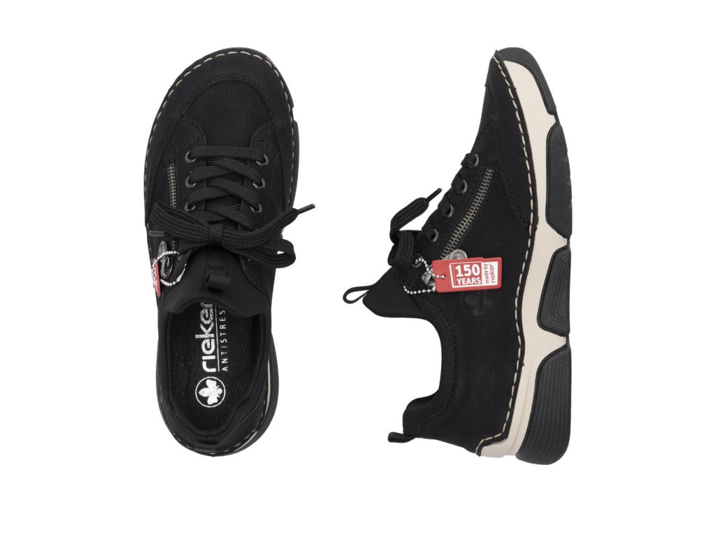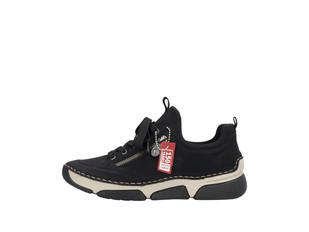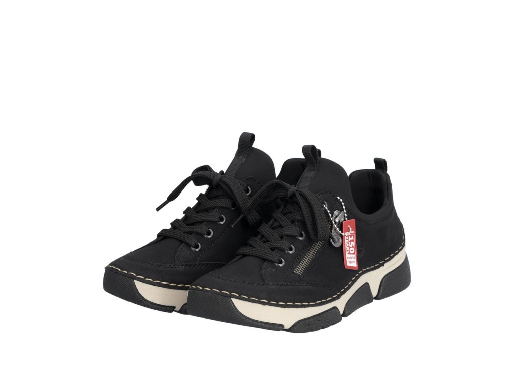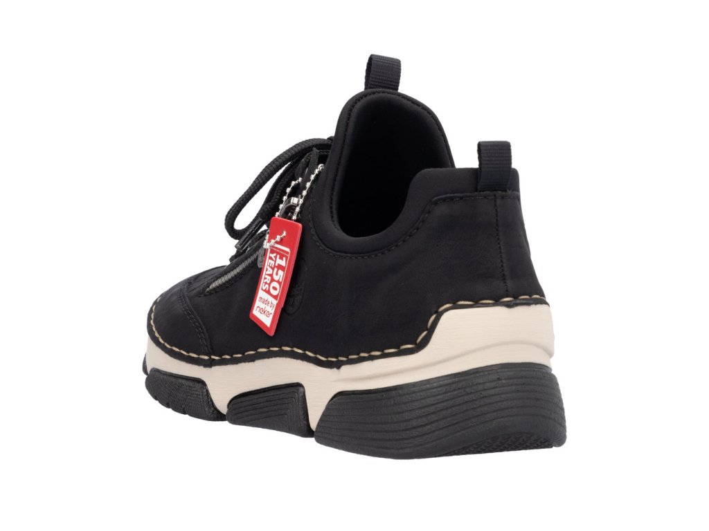 Nosíte ráda tenisky? Nemáte chuť vyzkoušet tento pohodlný model od výrobce RIEKER? Zajímavé tenisky v univerzální černé barvě s tkaničkami. Mírně zvýšená pata - cca 3,5 cm. Nazouvací model, tkaničky a ozdobný zip. Sneaker by RIEKER - dvojbarevná podešev s výrazným prošitím v přírodní barvě.