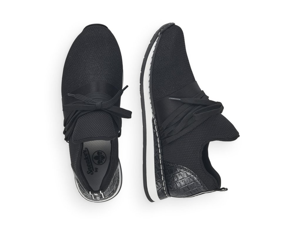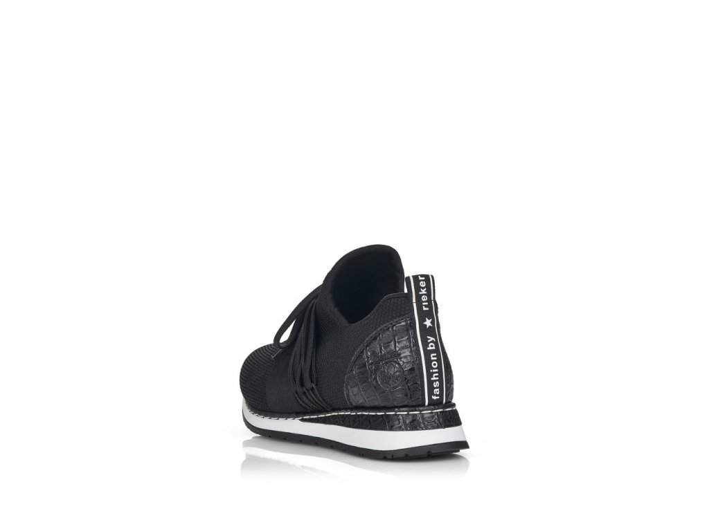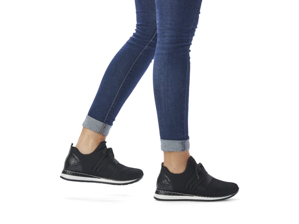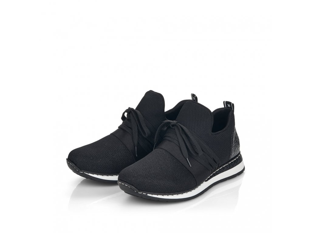Nosíte ráda tenisky? Nemáte chuť vyzkoušet tento model od výrobce RIEKER? Zajímavé tenisky - ,,black and white" barevná kombinace se stříbrnými odlesky na špičce. Mírně zvýšená pata - cca 3 cm. Nazouvací model, ozdobné tkaničky. Sneaker by RIEKER - bílá podešev s černými detaily.