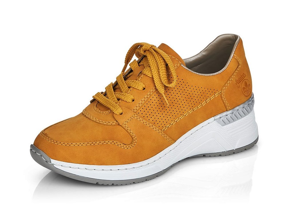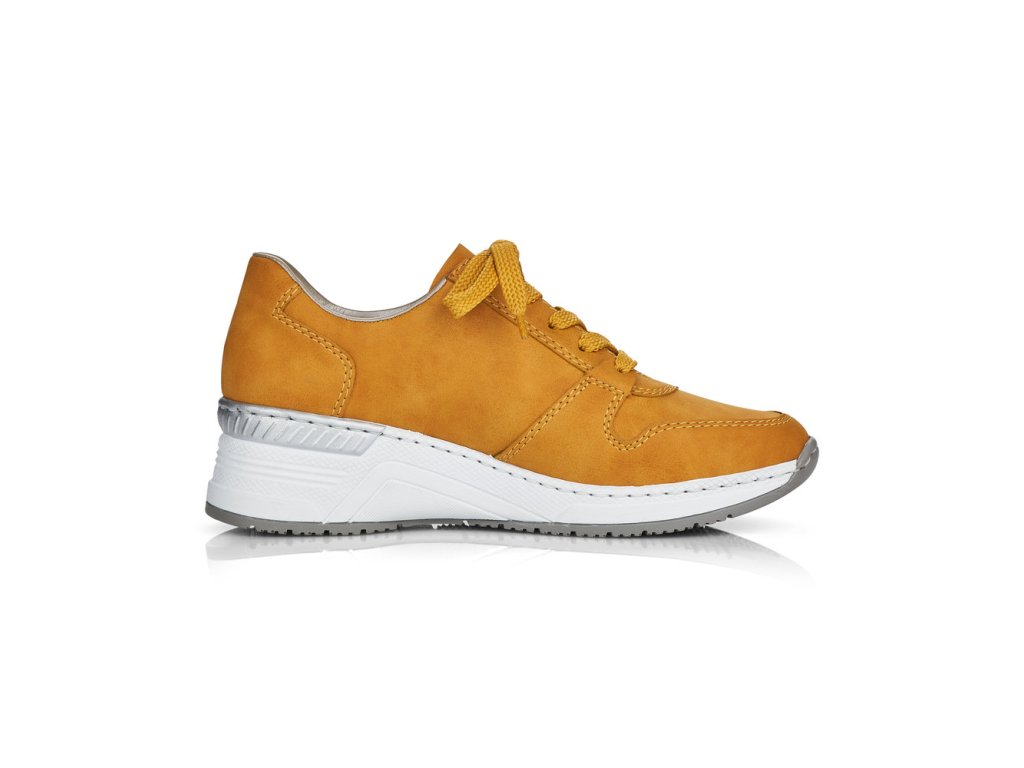 Nosíte ráda tenisky? Nemáte chuť vyzkoušet tento model od výrobce RIEKER? Zajímavé tenisky v módní žluté barvě. Mírně zvýšená pata - cca 5 cm. Stříbrný proužek na podešvi. Prošití v barvě.