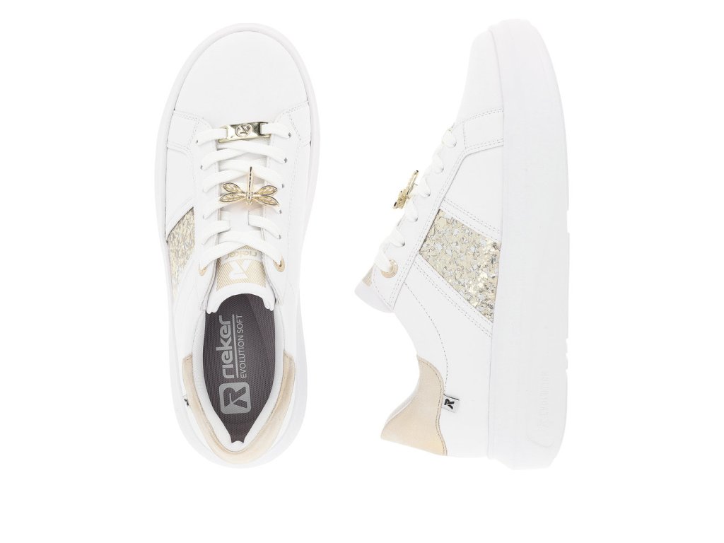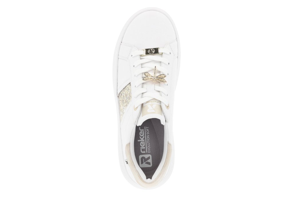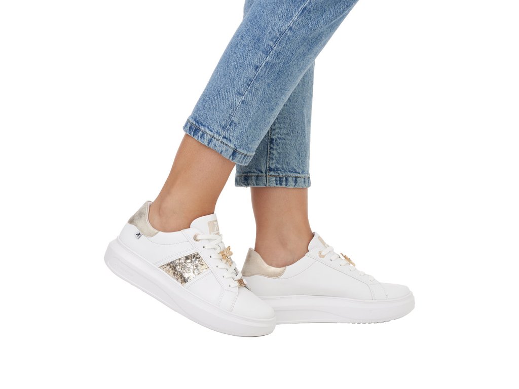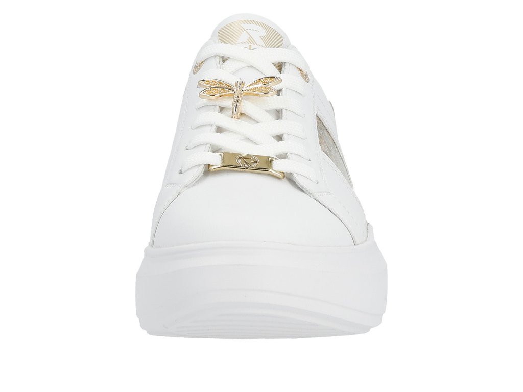 Dámské kožené tenisky RIEKER v bílé barvě. Vyjímatelná vyměkčená stélka, odlehčená podešev. Zlaté detaily, na tkaničce ozdobná zlatá vážka. Velice lehký model. Vyzkoušíte je?