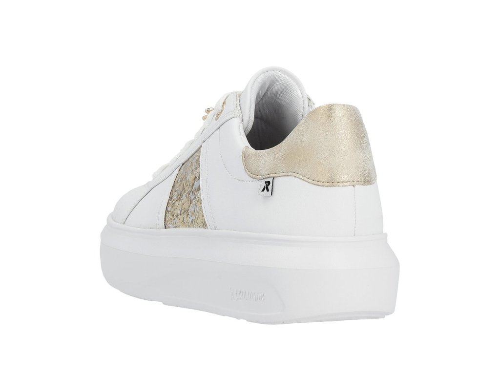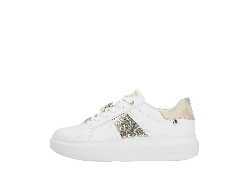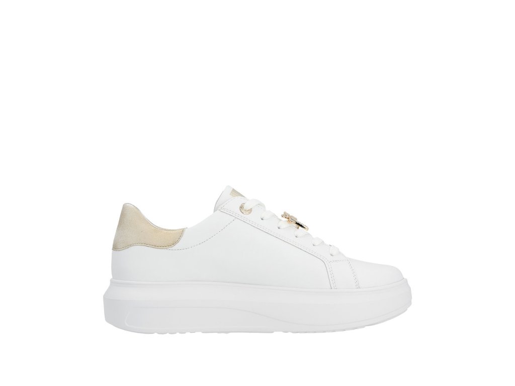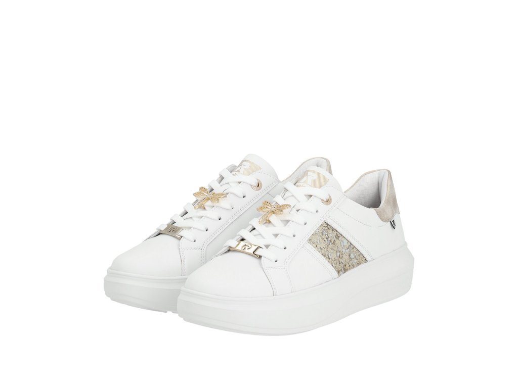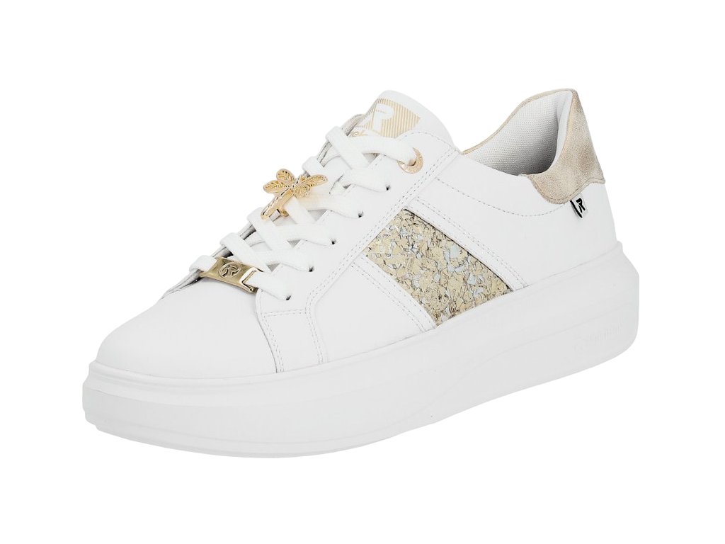 Dámské kožené tenisky RIEKER v bílé barvě. Vyjímatelná vyměkčená stélka, odlehčená podešev. Zlaté detaily, na tkaničce ozdobná zlatá vážka. Velice lehký model. Vyzkoušíte je?