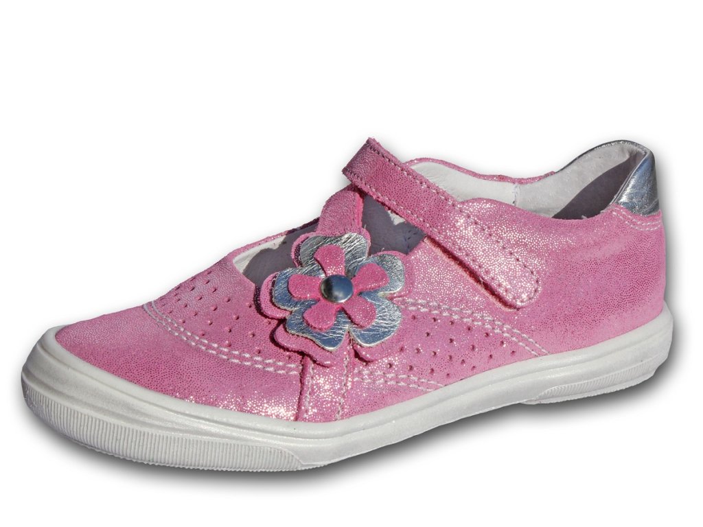 Dívčí růžová balerínka RICHTER ozdobená kytičkou, zapínání na 1 suchý zip. Metalický lesk.