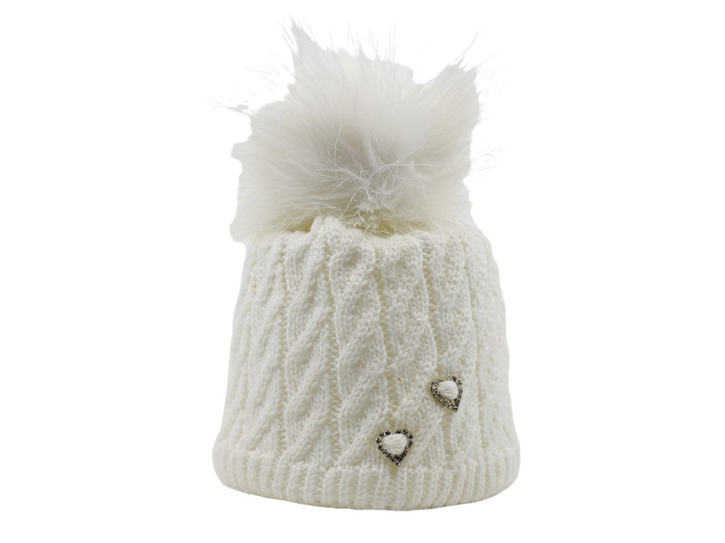 Uvnitř podšitá bílým fleesem - cca 8,5 cm. Bílá barva, 2 kovové aplikace ve tvaru srdíček s kamínky. Bambule - imitace kožešiny v bílé barvě.