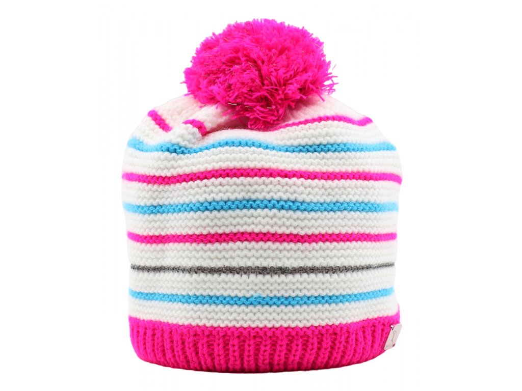 Uvnitř podšitá růžovým fleesem - cca 10 cm. Bílá barva s barevnými proužky v růžové a modré barvě, propletená stříbrná/reflexní nitka. Bambule v růžové barvě ze stejného materiálu jako čepice. Na straně našité kovové logo výrobce.