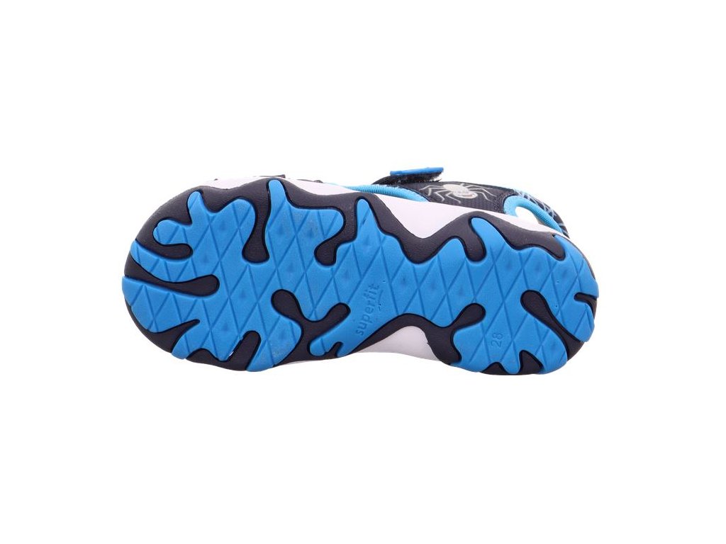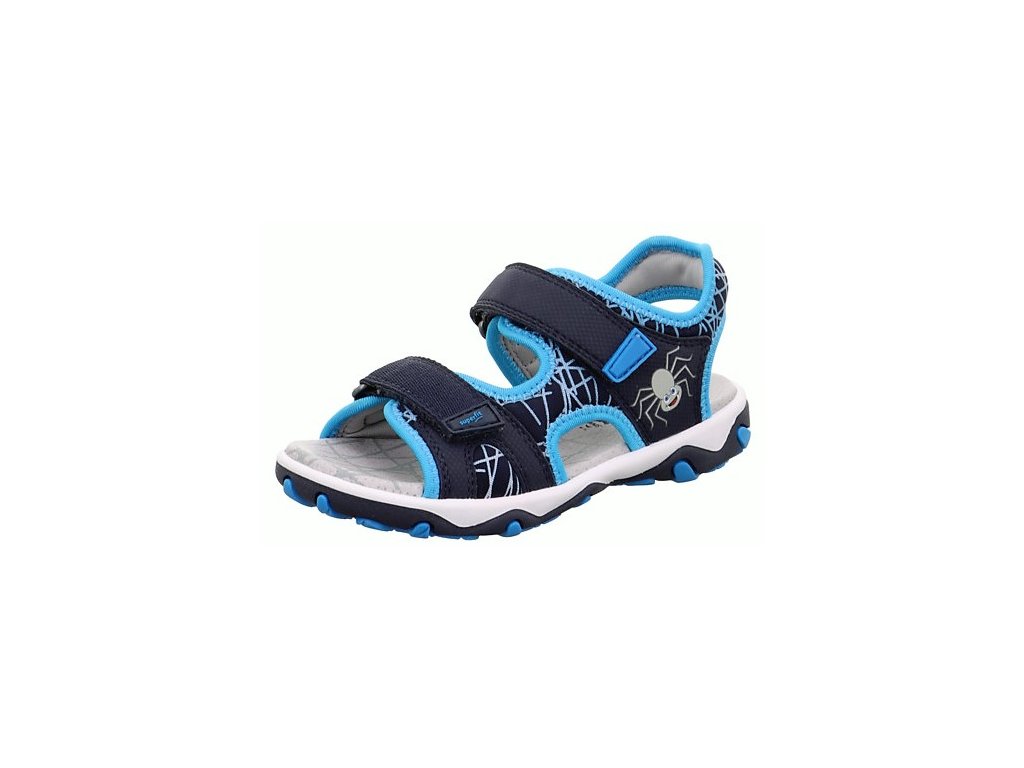 Chlapecké letní sandále SUPERFIT se zapínáním na 2 suché zipy. Kombinace různých modrých barev. Obrázek pavoučka.