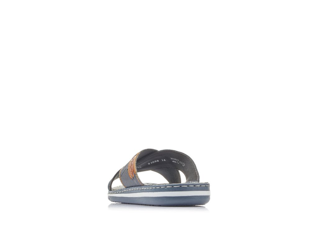 Pánské pantofle RIEKER v tmavě modré barvě s logem výrobce a oranžovým prošitím.